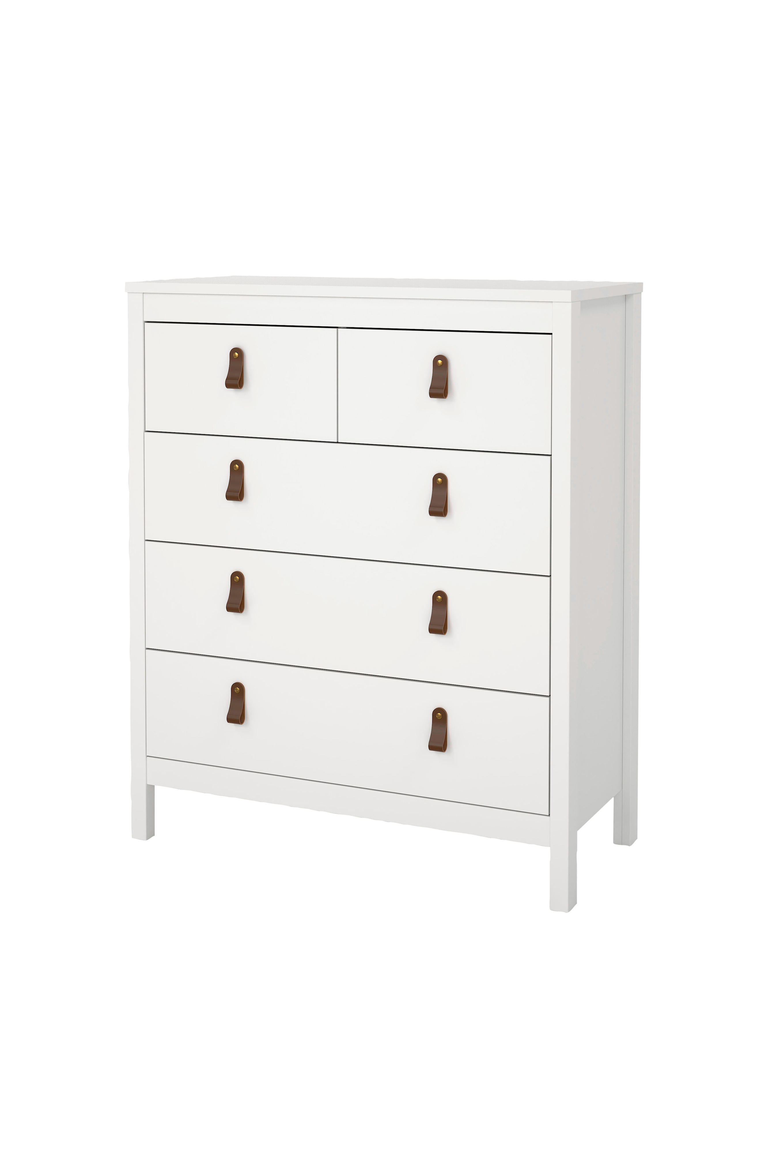 Løft dit rum med madrid-kisten, der passer perfekt ind i enhver moderne indretning og tilføjer et strejf af raffinement til dit værelse. Kommoden har fem skuffer og dermed masser af opbevaringsplads. Der medfølger to håndtag, et læderhåndtag og en knop, til at justere udseendet.