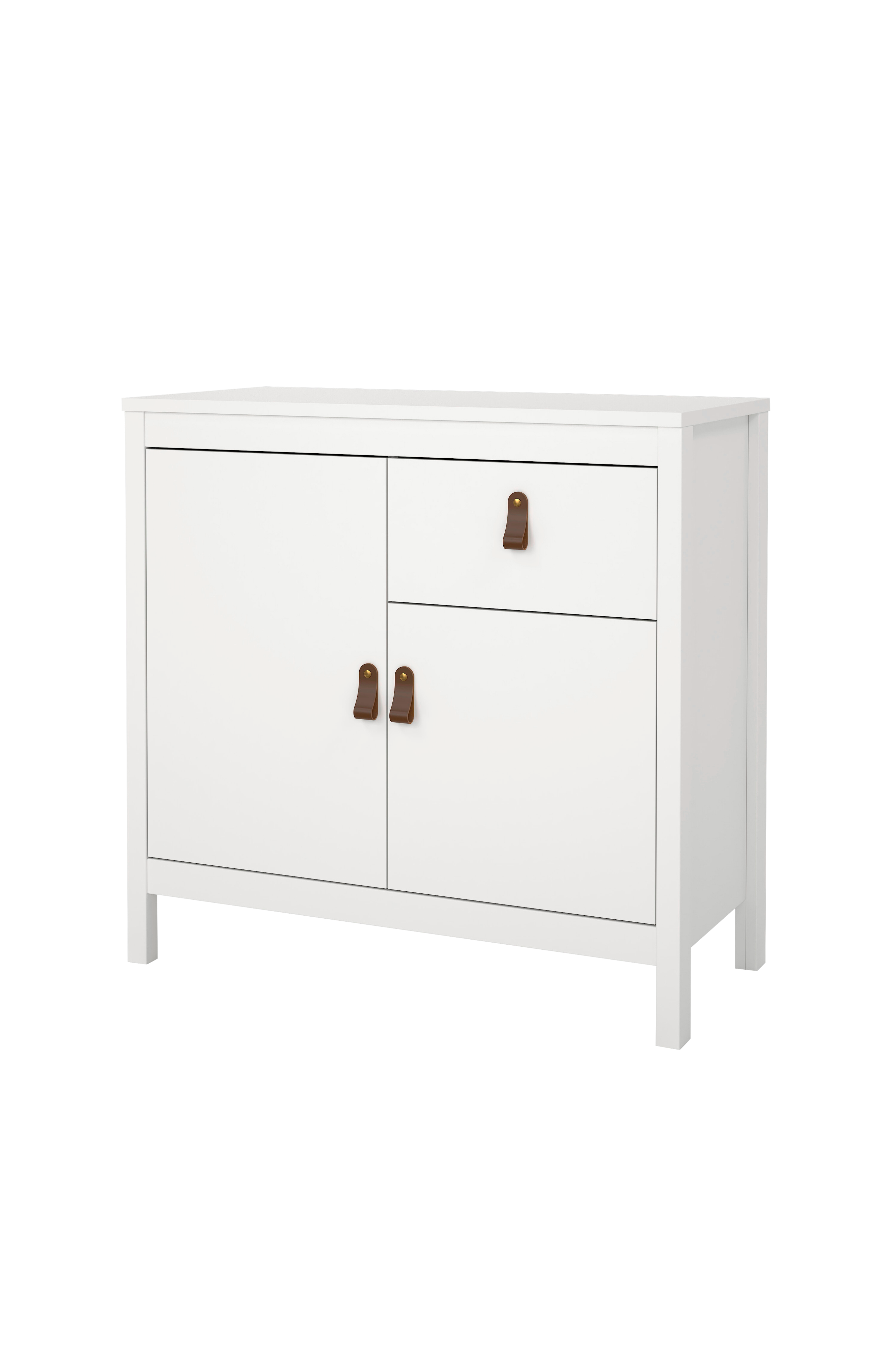Madrid-skænken er et alsidigt, moderne og nutidigt møbel, der kan forbedre forskellige rum i dit hjem, herunder stuen, gangen og meget mere. Den har to døre, en justerbar hylde og en skuffe, som giver masser af opbevaringsplads, så du kan holde styr på dine ting. Derudover gør den rummelige bordplade det nemt at udstille dine yndlingsting. Der medfølger to håndtag, et i læder og et med knop, til at justere udseendet.