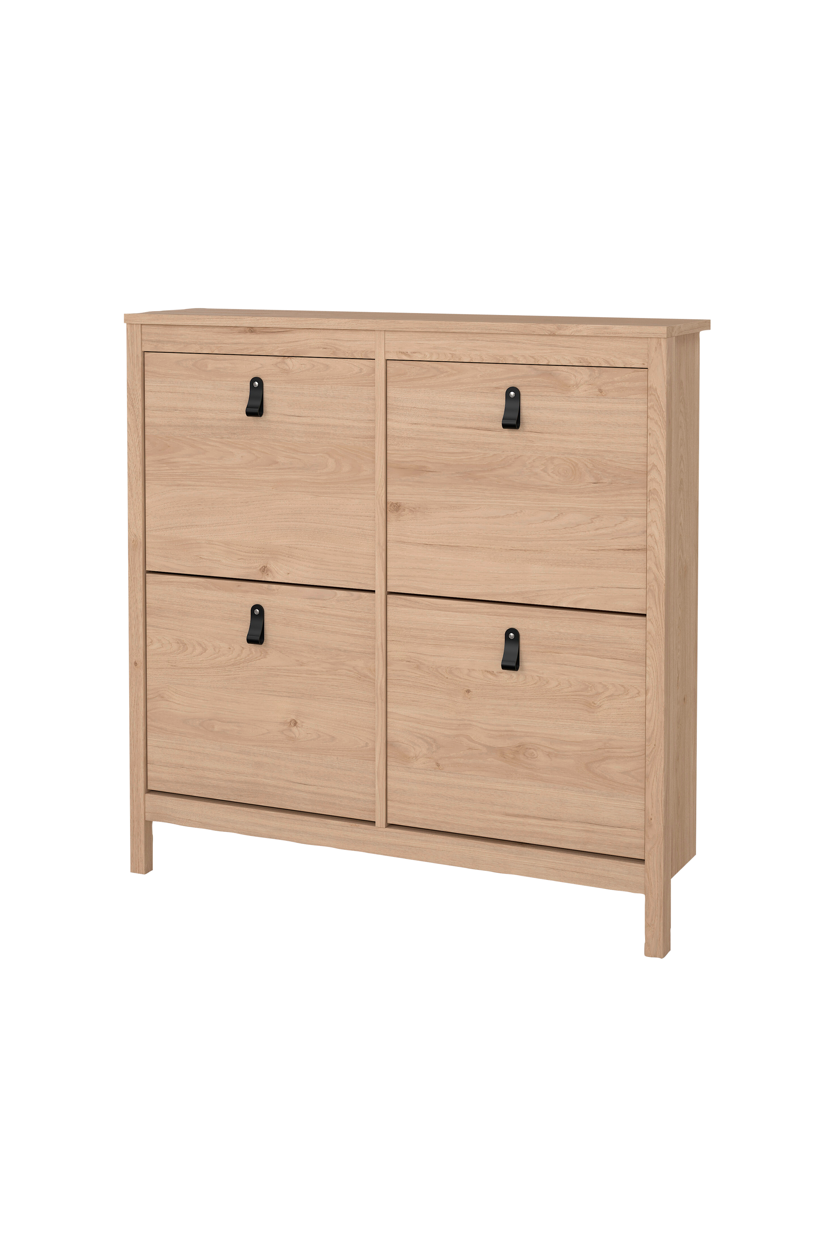 Madrid-skoskabet er en alsidig og pladsbesparende opbevaringsløsning til dine sko. Med fire udfoldelige døre tilbyder dette skab en diskret og praktisk måde at holde dine sko pænt skjult på. Det kan rumme op til 16 par sko og sikrer, at dit fodtøj forbliver organiseret og let tilgængeligt. Der medfølger to håndtag, et i læder og et med knop, så du kan justere udseendet.