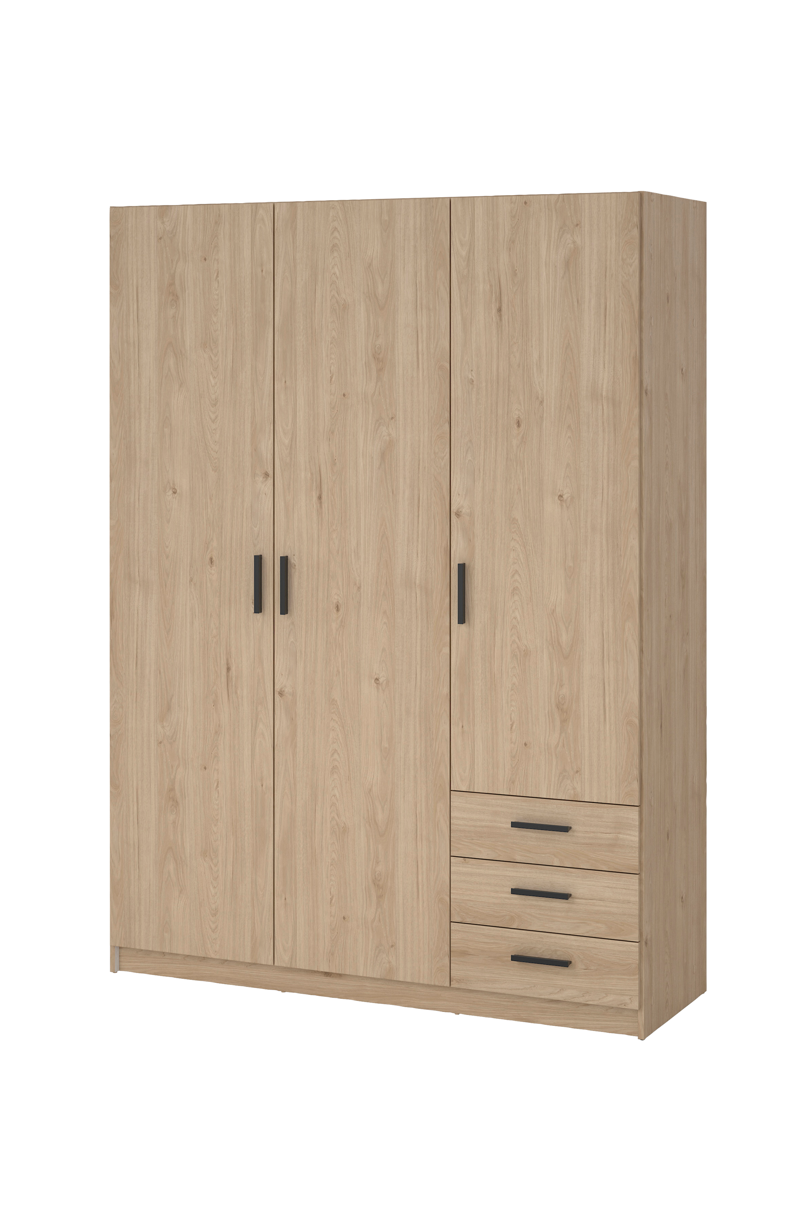 Sprint-garderoben er en funktionel og rummelig opbevaringsløsning med tre hængslede døre, en bøjlestang og tre skuffer. Det har fire hylder, to justerbare og to faste, som giver alsidig plads til tøj og andre ting. Det er designet til at være praktisk og passer perfekt til ethvert moderne hjem.