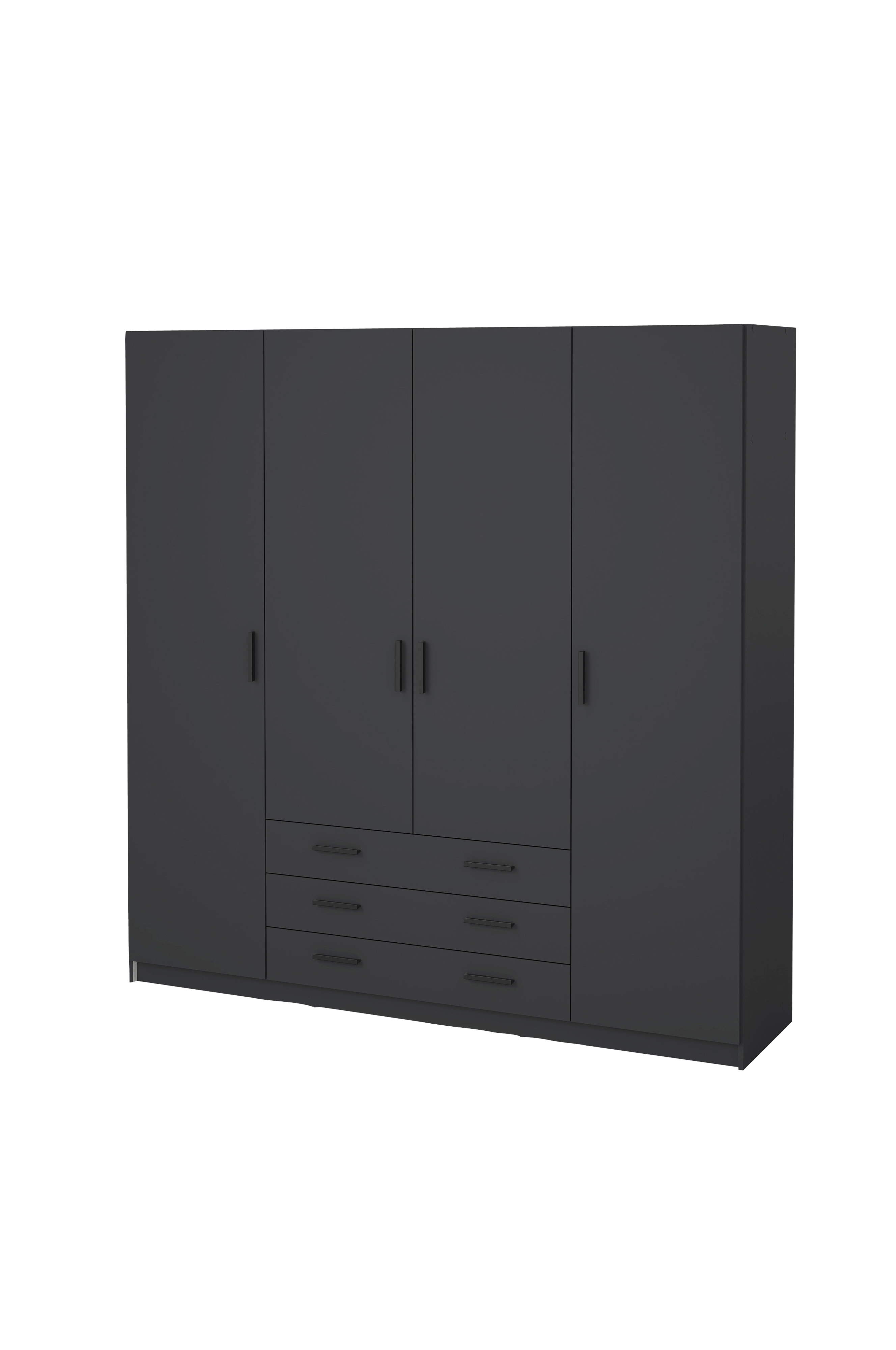 Sprint-garderoben er en funktionel og rummelig opbevaringsløsning med fire hængslede døre, en bøjlestang og tre skuffer. Det har otte hylder, seks justerbare og to faste, som giver alsidig plads til tøj og andre vigtige ting. Det er designet til at være praktisk og passer perfekt til ethvert moderne hjem.