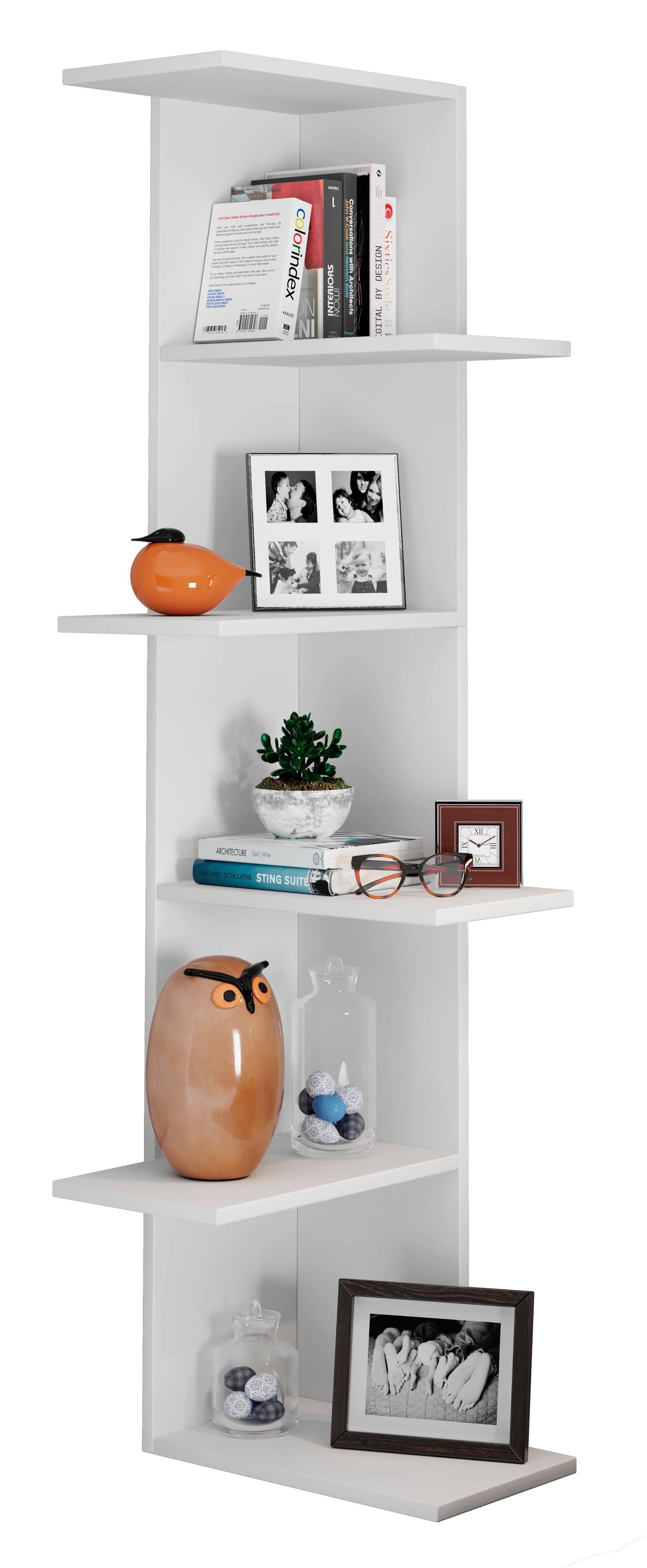 Hjørnehylden tilbyder tilstrækkelig opbevaringsplads med 5 rum. Der medfølger montagemateriale til at montere hylden på gulvet eller alternativt på væggen, alt efter dine personlige behov.