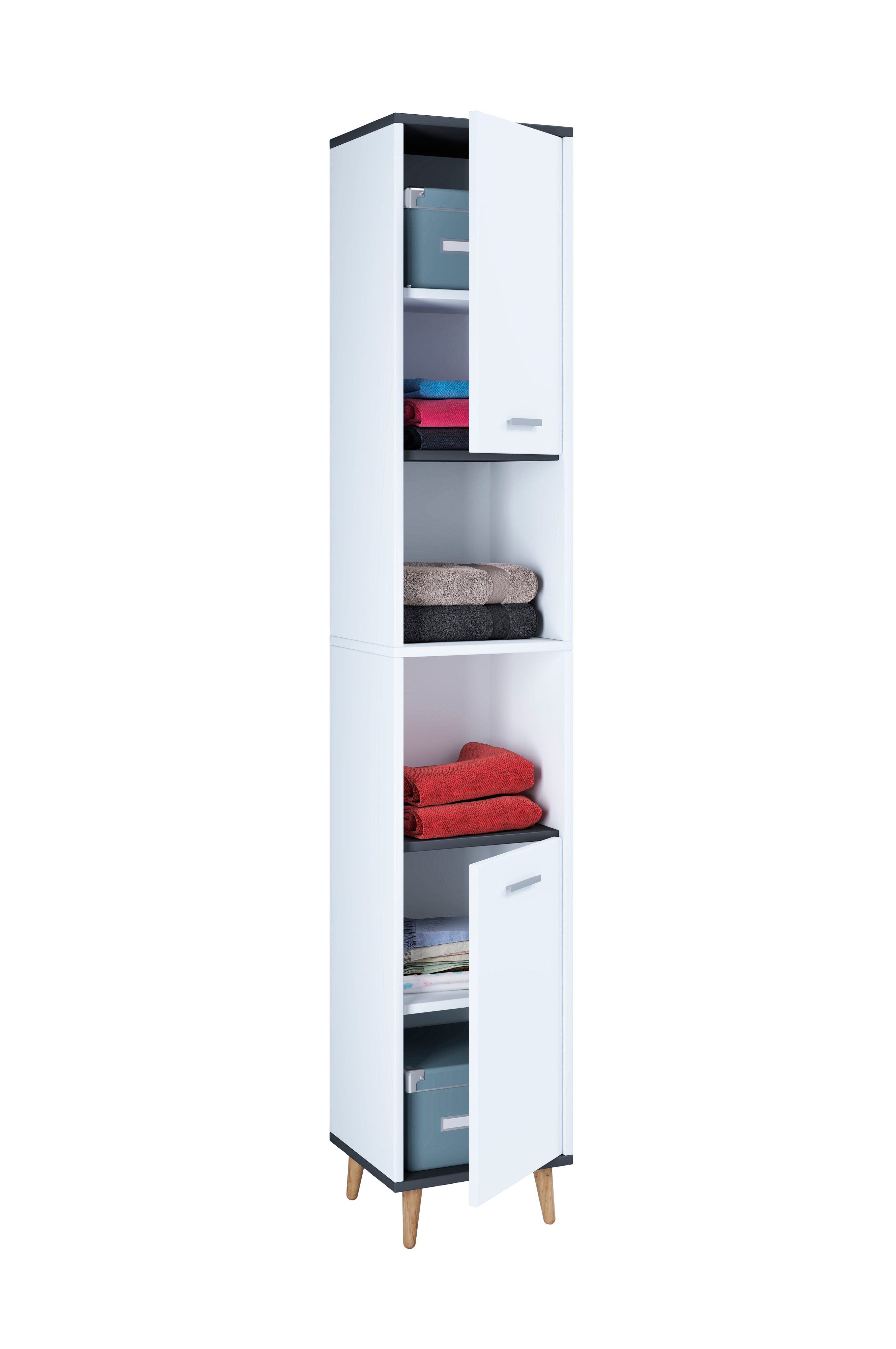 På grund af det tidløse og enkle design er vcm-badeværelsesskabet ""landos"" et smukt blikfang på ethvert badeværelse. Det høje skab med melaminbelægning er særligt let at rengøre og modstandsdygtigt over for fugt.