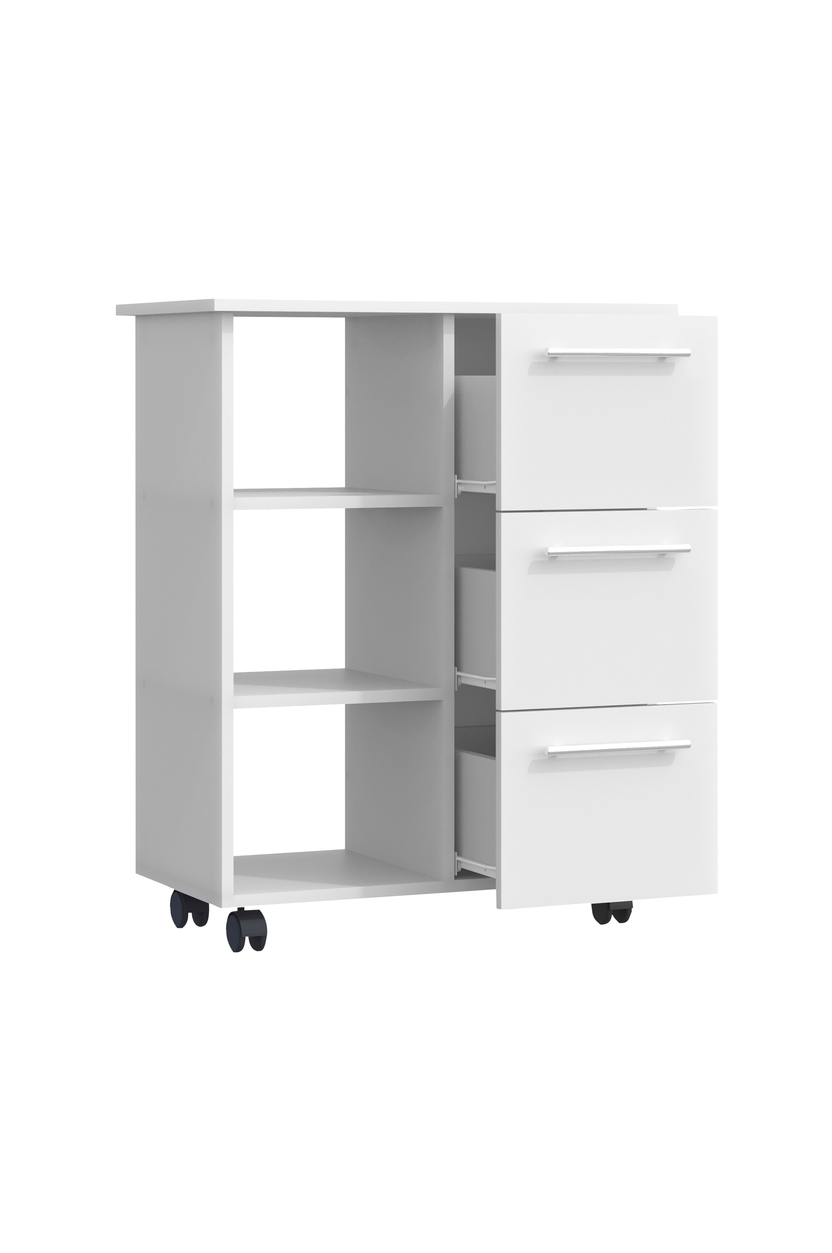 praktisk og rummelig køkkenvogn til ekstra opbevaringsplads i køkkenet. tre skuffer og tre åbne rum gør denne mobile serveringsvogn til et opbevaringsvidunder.