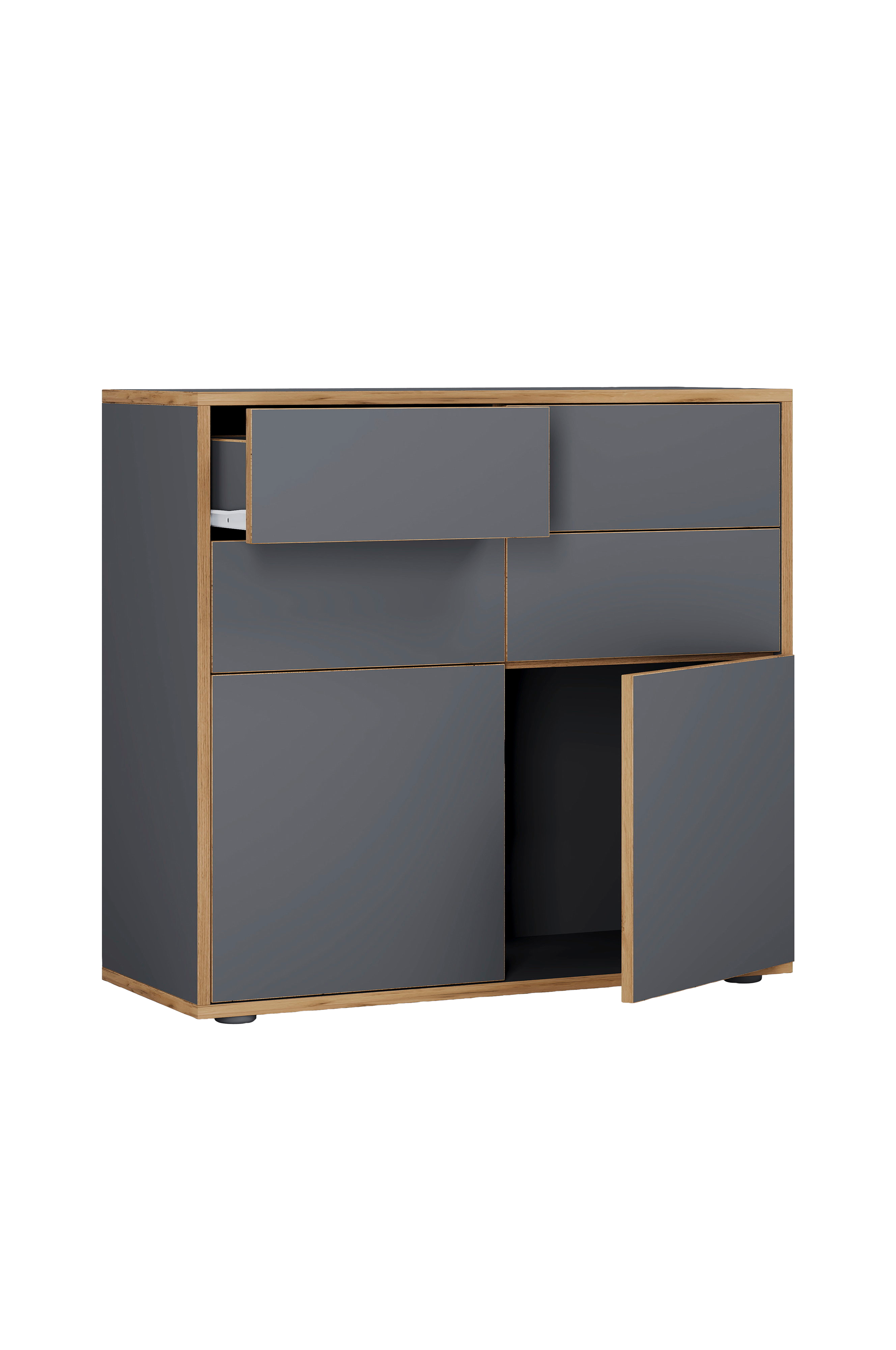 Møblet er fremstillet af robust træ og har et tidløst design. Hyldeoverfladen har en robust melaminharpiksbelægning. Det gør produktet let at rengøre og sikrer en lang levetid. Kommoden har to hængslede låger og fire skuffer, som giver masser af opbevaringsplads. Dørene og skufferne har ingen håndtag og kan åbnes med den moderne push-to-open-funktion.