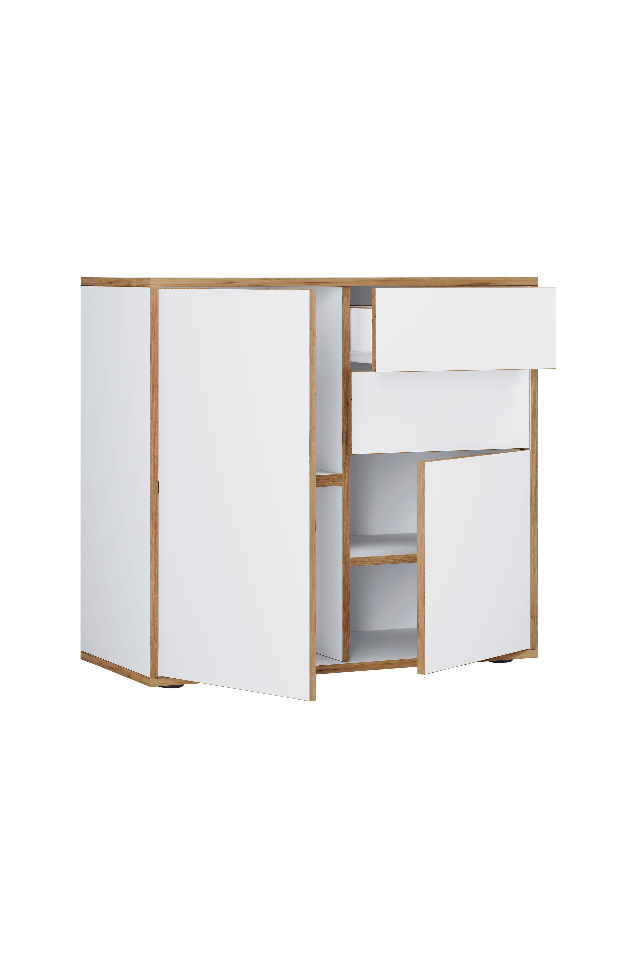 Møblet er fremstillet af robust træ og har et tidløst design. Hyldeoverfladen har en robust melaminharpiksbelægning. Det gør produktet let at rengøre og sikrer en lang levetid. Kommoden har to hængslede låger og to skuffer, som giver masser af opbevaringsplads. Dørene og skufferne har ingen håndtag og kan åbnes med den moderne push-to-open-funktion.