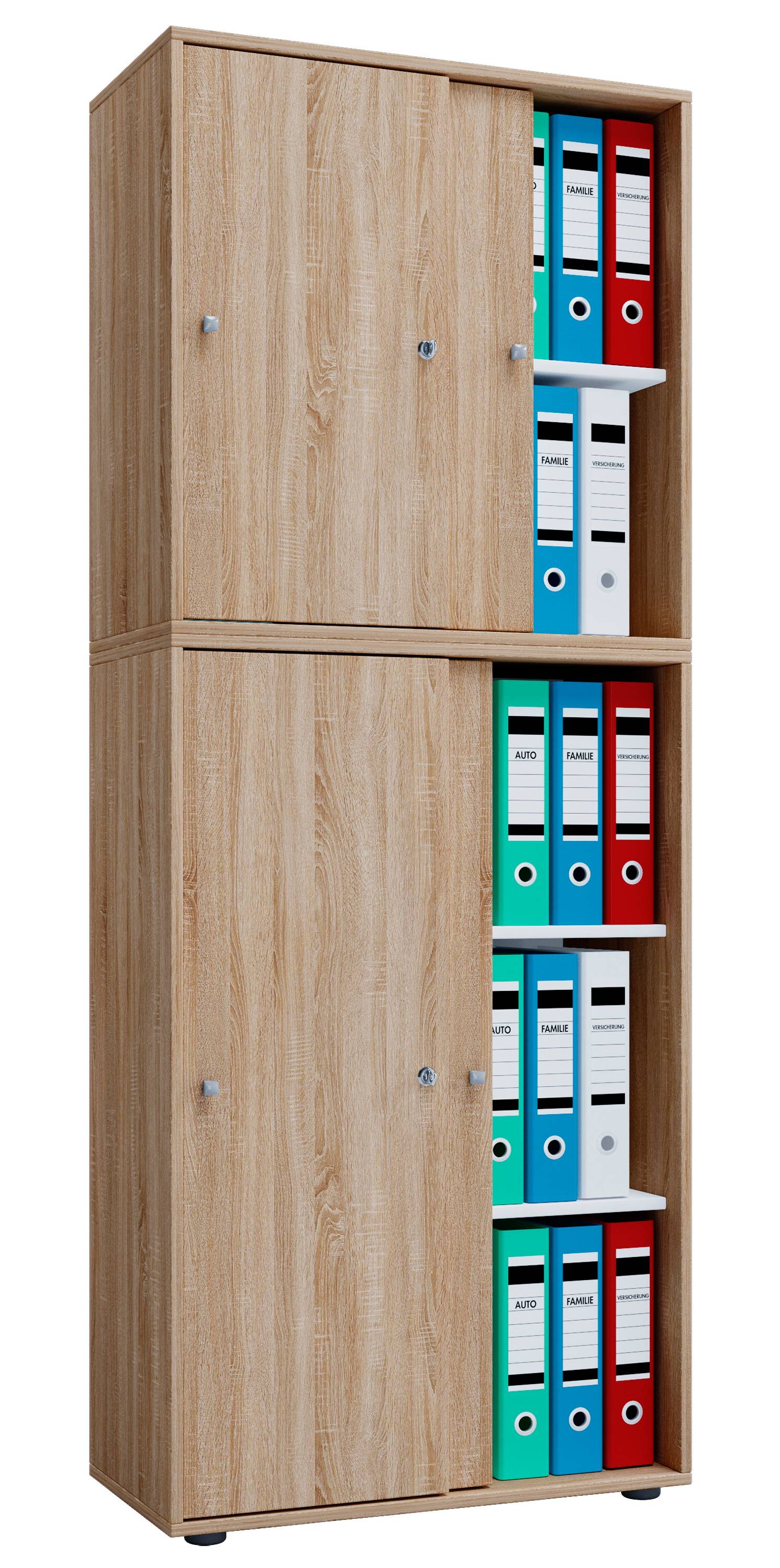 vcm "lona xxl " kontorskab med låsbare skydedøre har fire hylder og plads til 35 mapper og andre redskaber. Kroppen er lavet af en gengivelse af træstruktur og har et robust bagpanel.