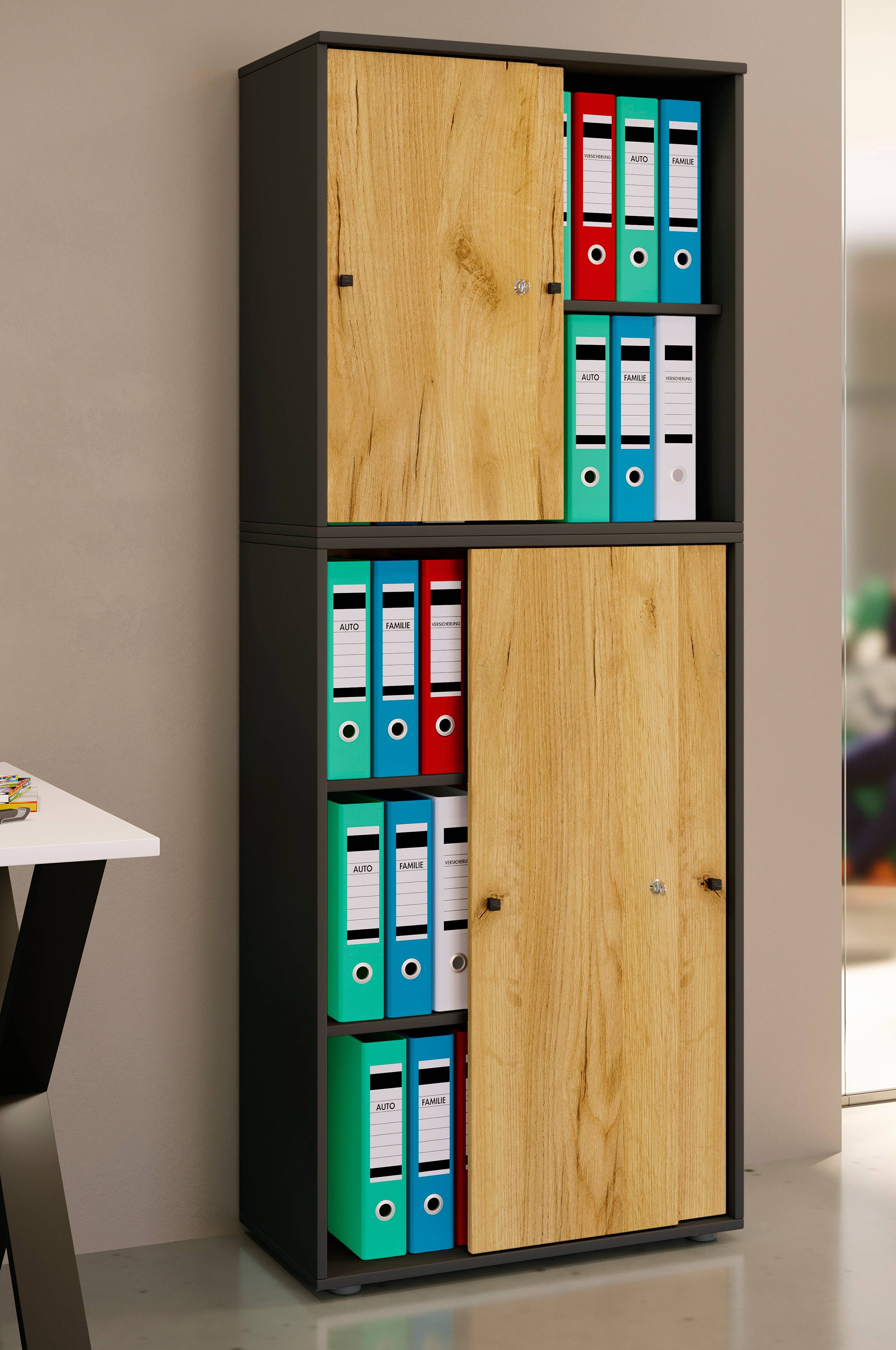 vcm "lona xxl " kontorskab med låsbare skydedøre har fire hylder og plads til 35 mapper og andre redskaber. Kroppen er lavet af en gengivelse af træstruktur og har et robust bagpanel.