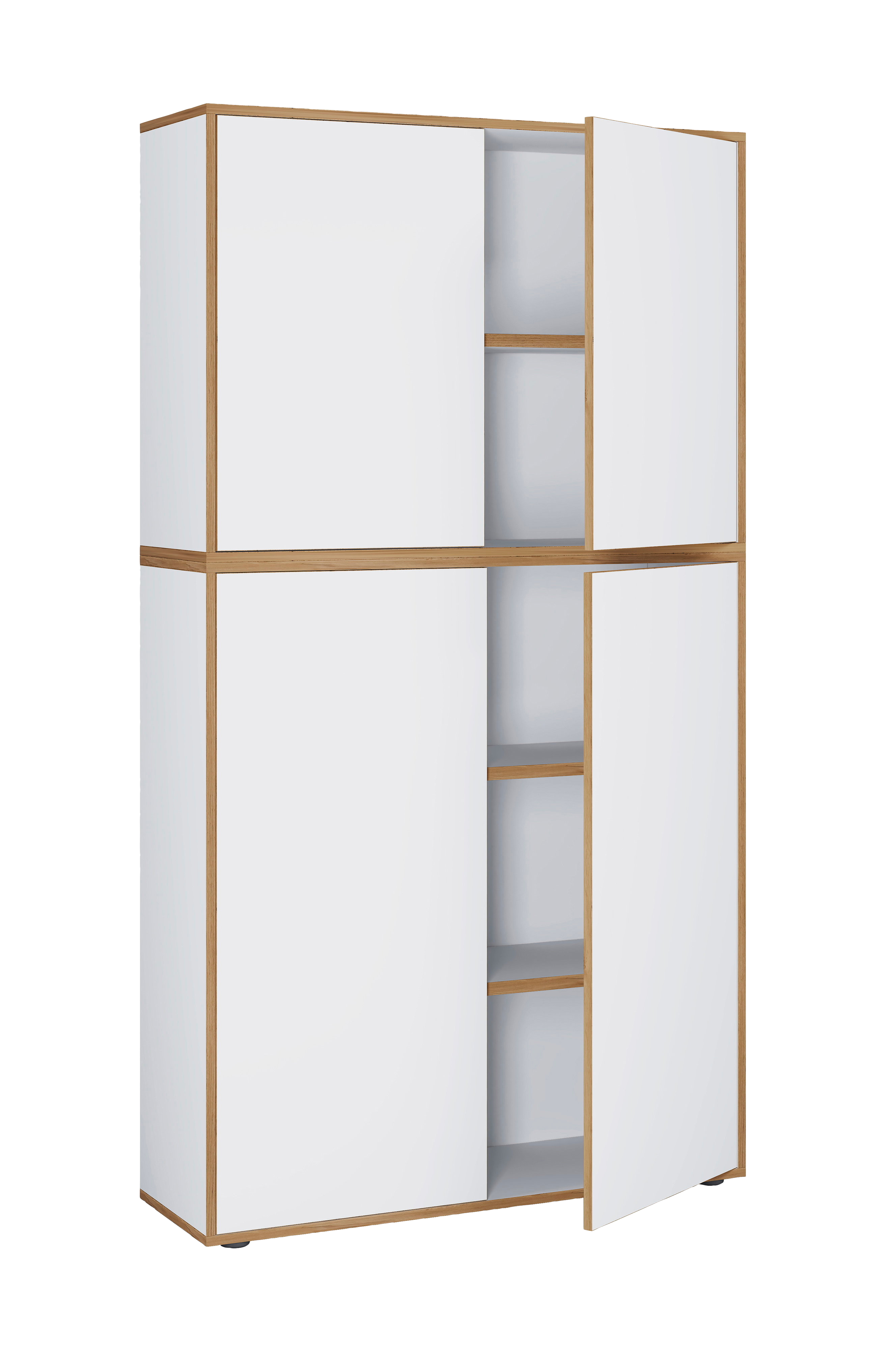 Møblet er lavet af robust træ og har et tidløst design. Hyldeoverfladen har en robust melaminharpiksbelægning. Det gør kommoden nem at rengøre og sikrer en lang levetid. Skænken har fire hængslede døre, som giver lukket opbevaringsplads. Hylderne er højdejusterbare og kan derfor tilpasses individuelle behov.
