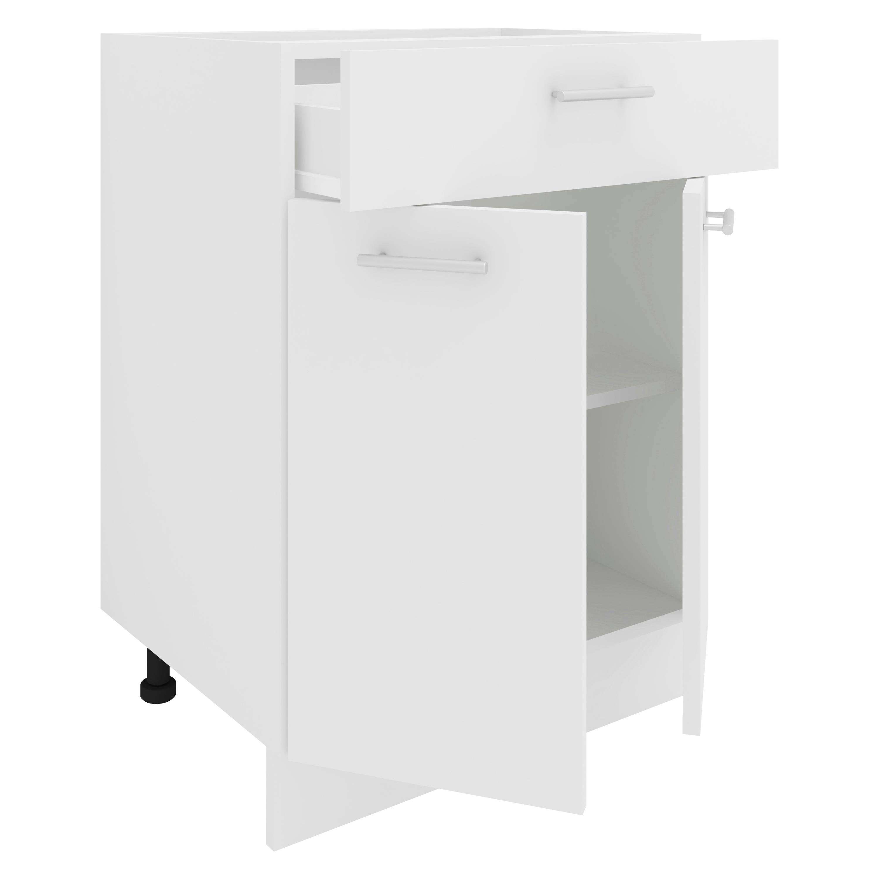 vcm-køkkenskabet med to hængslede doors og en drawer er særligt moderne og giver masser af opbevaringsplads til køkkenredskaber. Korpus er 16 mm tykt og derfor særligt stabilt.