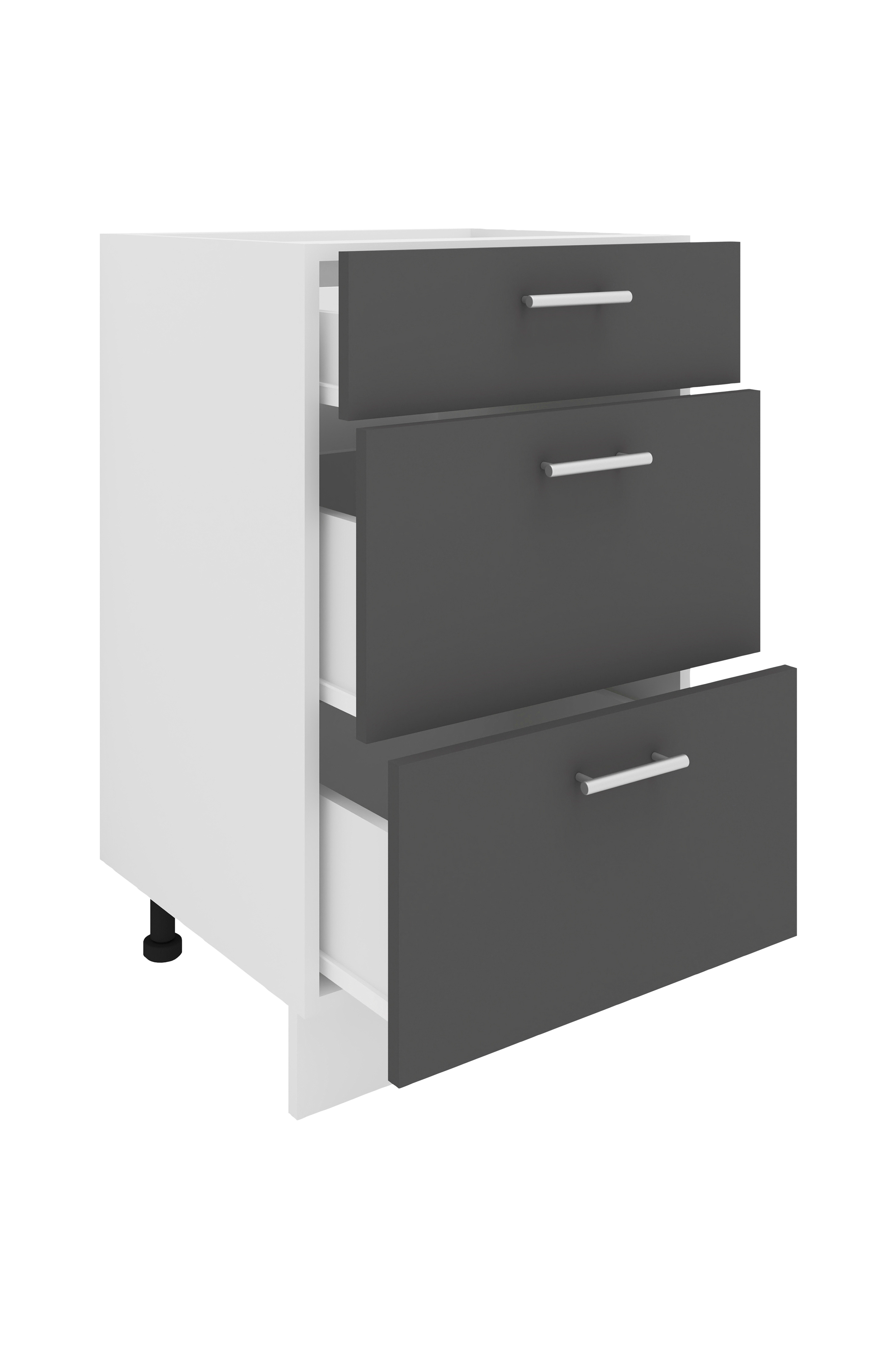 vcm-køkkenskabet med tre drawers er særligt moderne og giver masser af opbevaringsplads til køkkenredskaber. Korpus er 16 mm tyk og derfor særlig stabil.