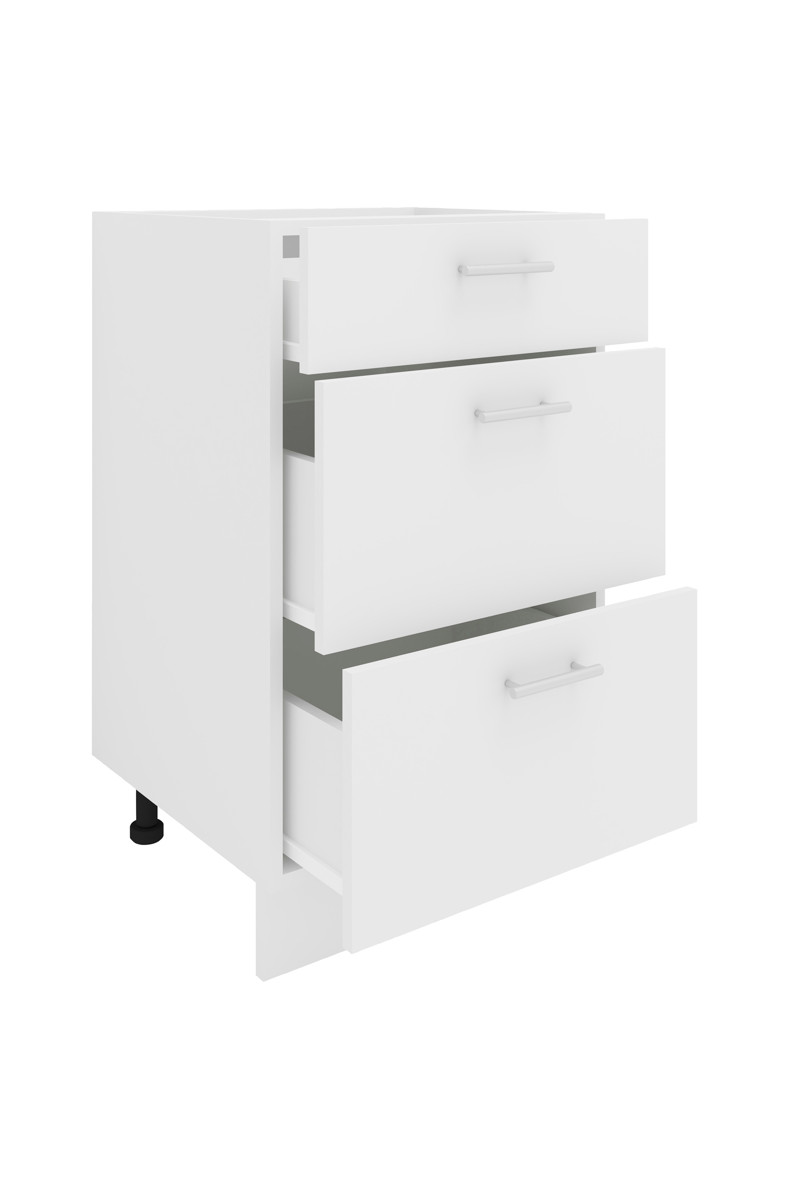 vcm-køkkenskabet med tre drawers er særligt moderne og giver masser af opbevaringsplads til køkkenredskaber. Korpus er 16 mm tyk og derfor særlig stabil.