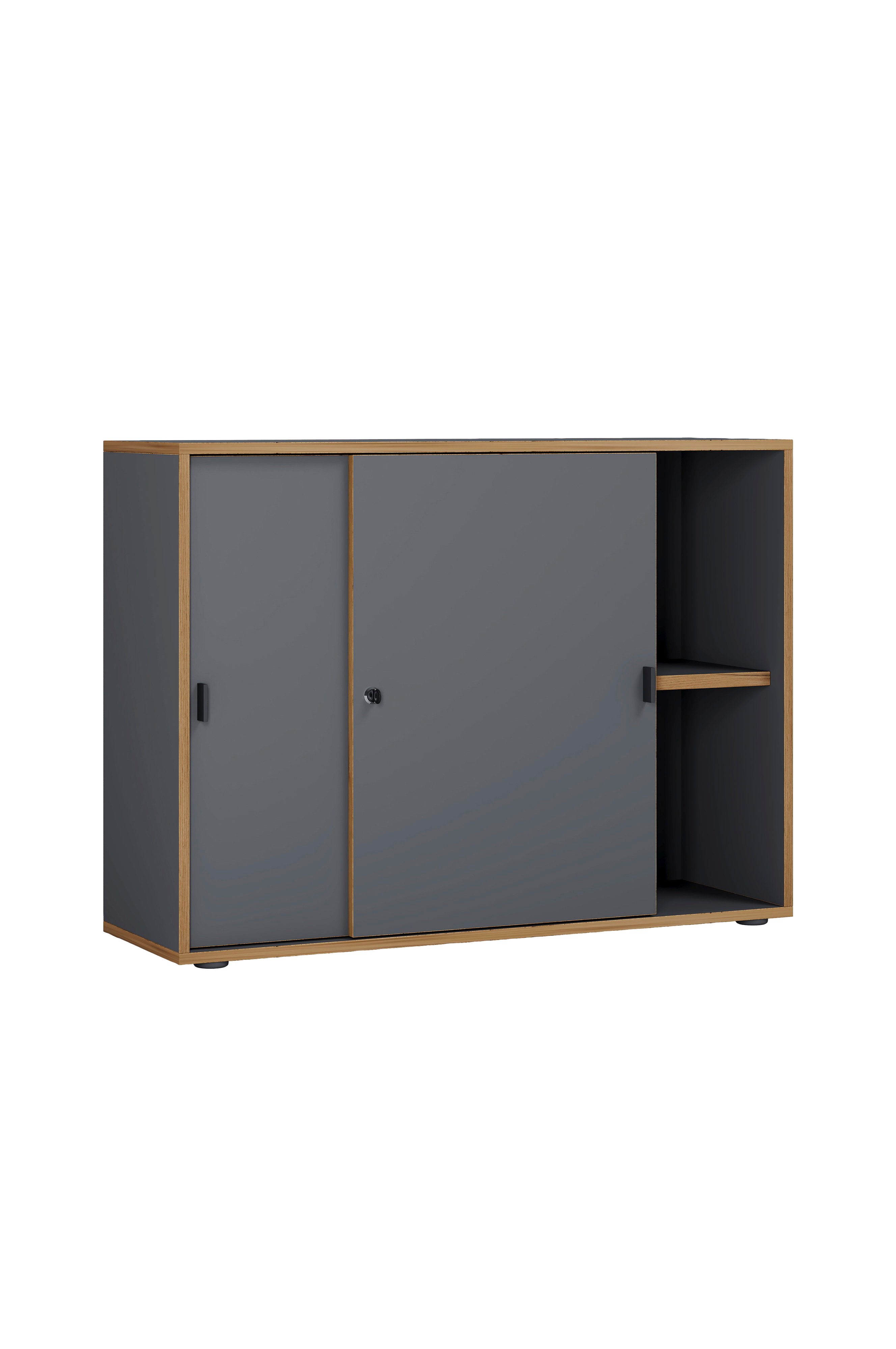 Møblet er lavet af robust træ og har et tidløst design. Hyldeoverfladen har en robust melaminharpiksbelægning. Det gør kommoden nem at rengøre og sikrer en lang levetid. Skænken har to skydedøre, der kan låses. Hylden er højdejusterbar og kan derfor tilpasses individuelle behov.