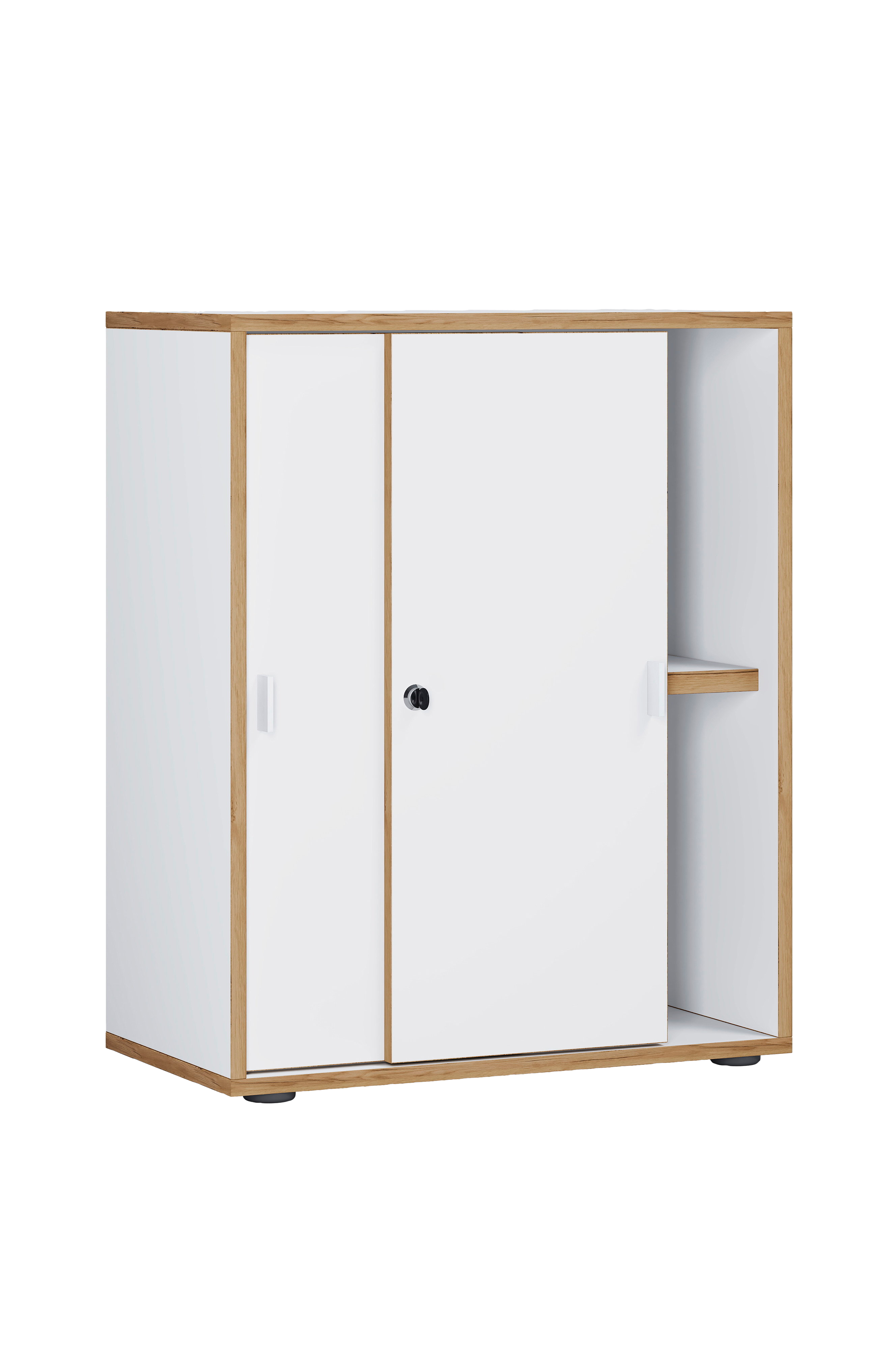 Møblet er lavet af robust træ og har et tidløst design. Hyldeoverfladen har en robust melaminharpiksbelægning. Det gør kommoden nem at rengøre og sikrer en lang levetid. Skænken har to skydedøre, der kan låses. Hylden er højdejusterbar og kan derfor tilpasses individuelle behov.
