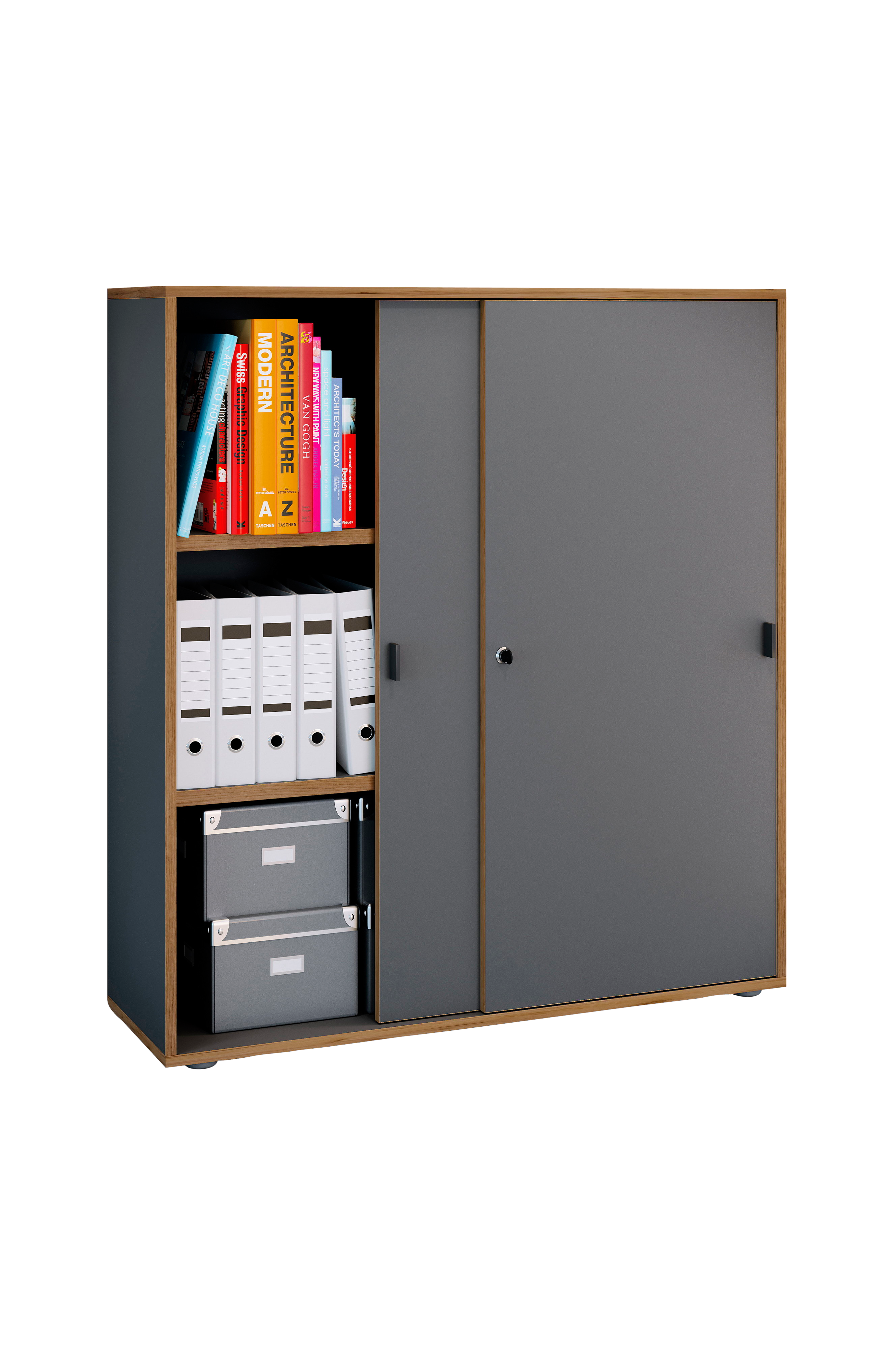 Møblet er lavet af robust træ og har et tidløst design. Hyldeoverfladen har en robust melaminharpiksbelægning. Det gør kommoden nem at rengøre og sikrer en lang levetid. Skænken har to skydedøre, der kan låses. Hylderne er højdejusterbare og kan derfor tilpasses individuelle behov.