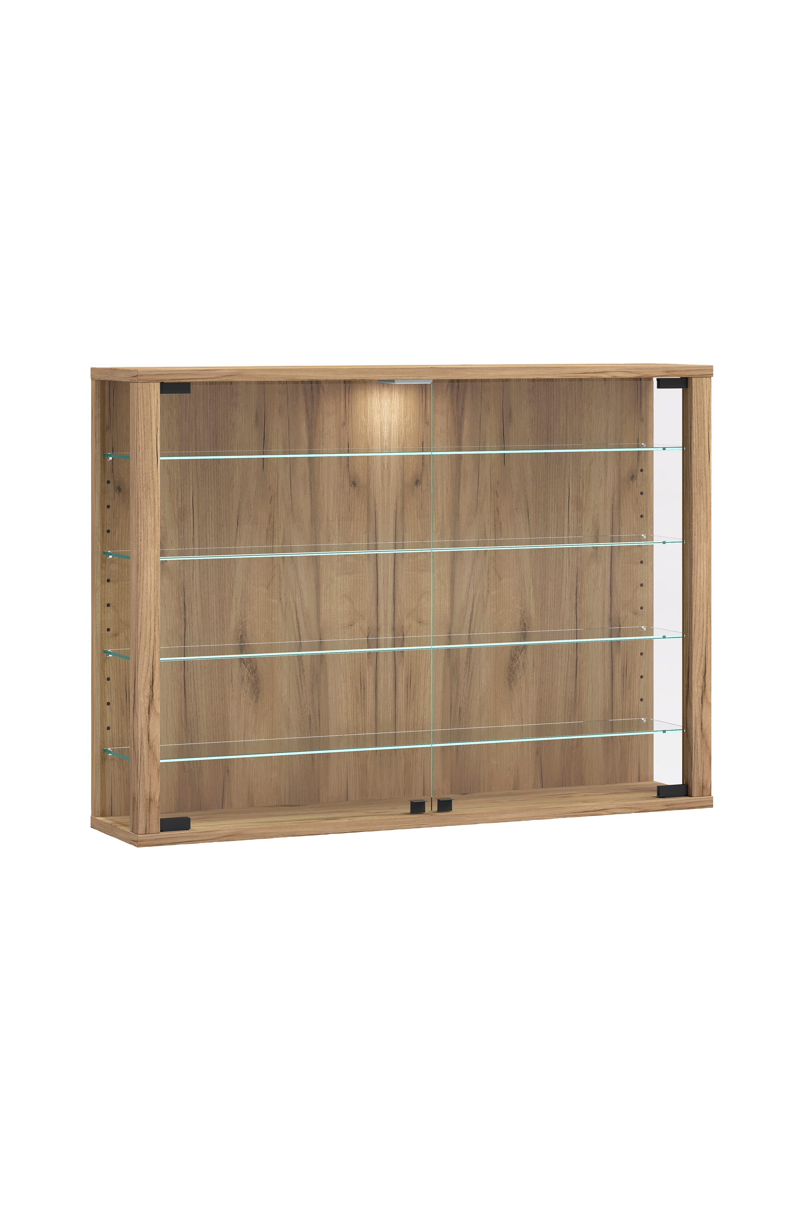 Designeren har brugt robuste træbaserede materialer til kroppen. Dørene er lavet af hærdet sikkerhedsglas, som giver øget slag- og stødmodstand. Vitrineskabet forvandler enhver væg til et absolut blikfang.