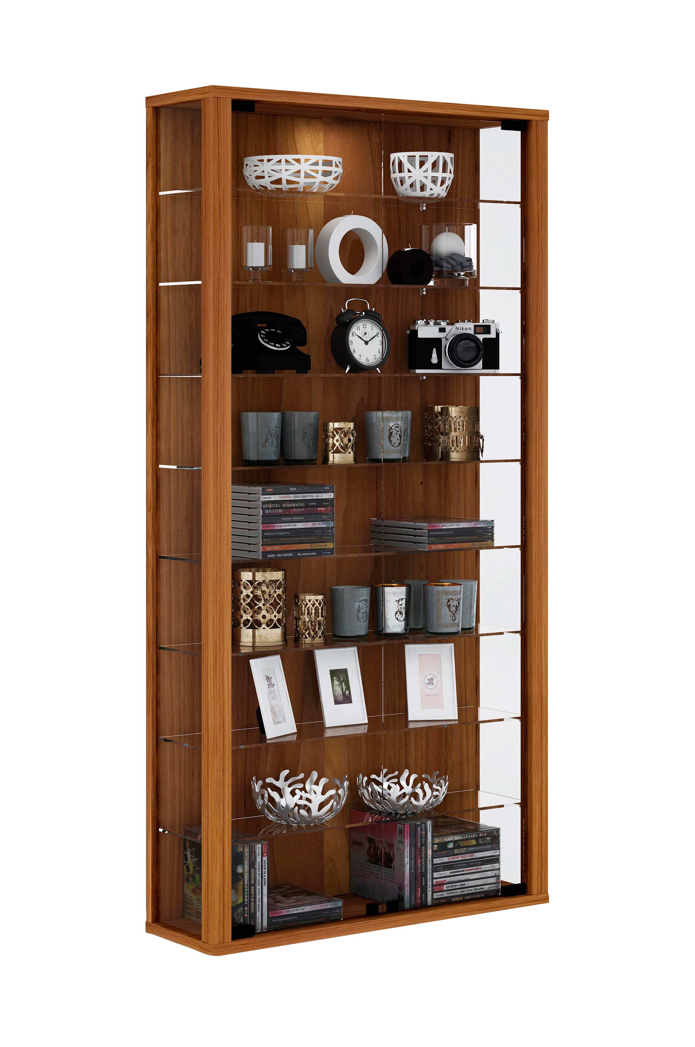 - Glasskabet indeholder 8 glashylder, sidedele og døre er lavet af ESG-forstærket sikkerhedsglas.
