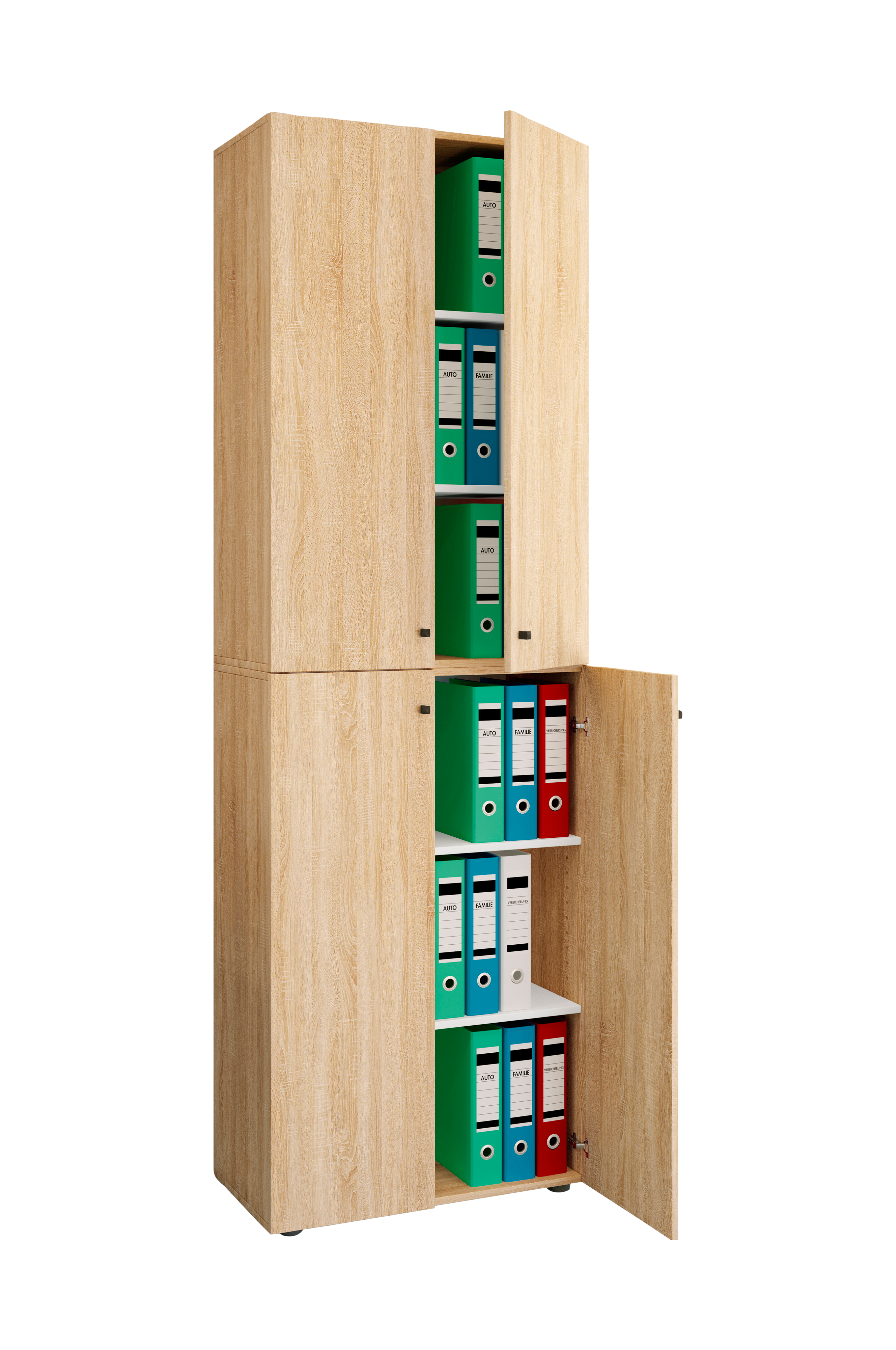vcm "lona xl reol med fire hængslede døre" har fire variable hylder og plads til ca. 42 mapper og andre redskaber. Skabet kan kombineres med andre møbler fra serien "vcm lona ".