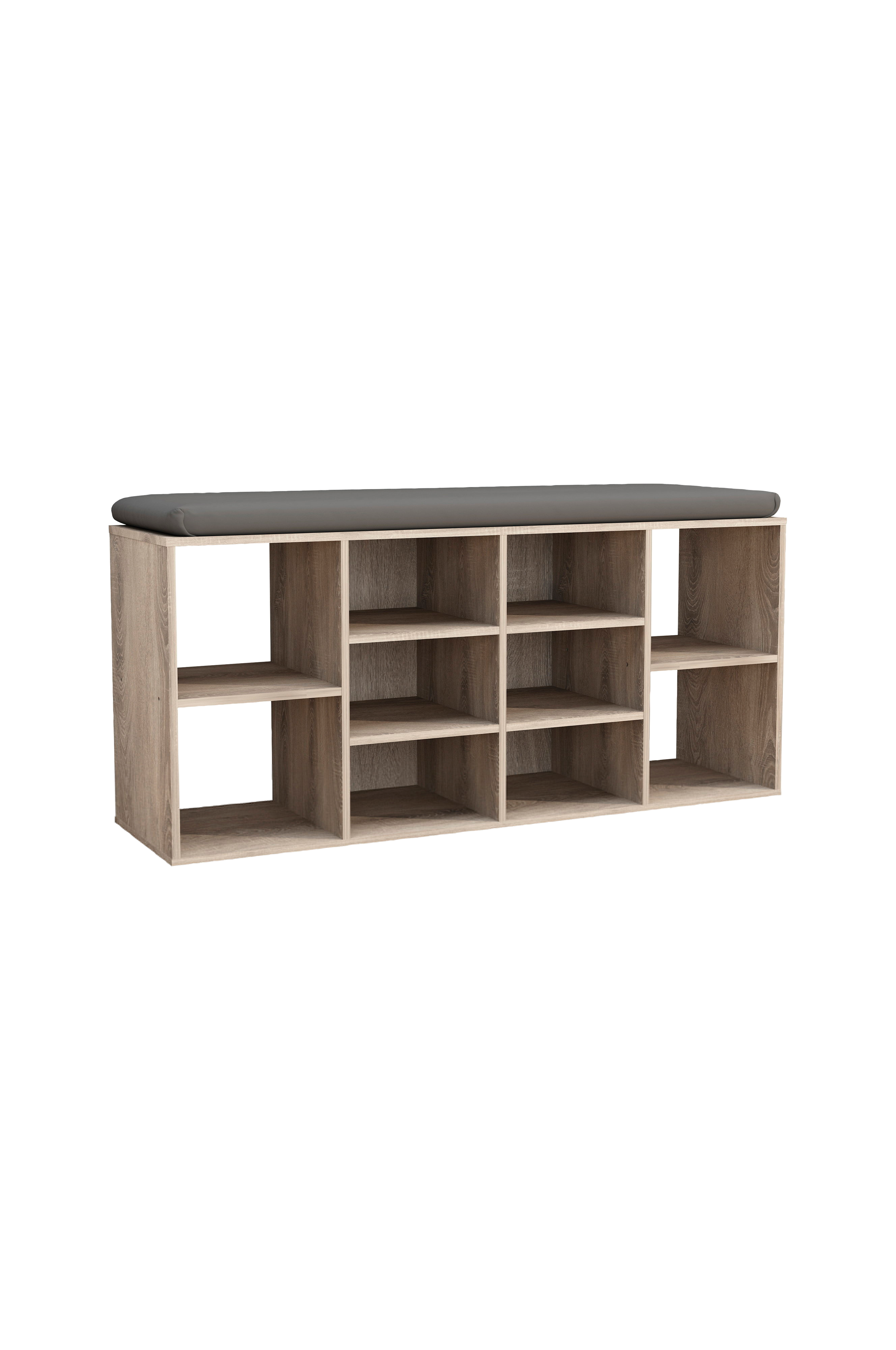 Ti rum giver plads nok til ti par sko eller andre redskaber. Samtidig tilbyder gangmøblet en praktisk siddeplads.