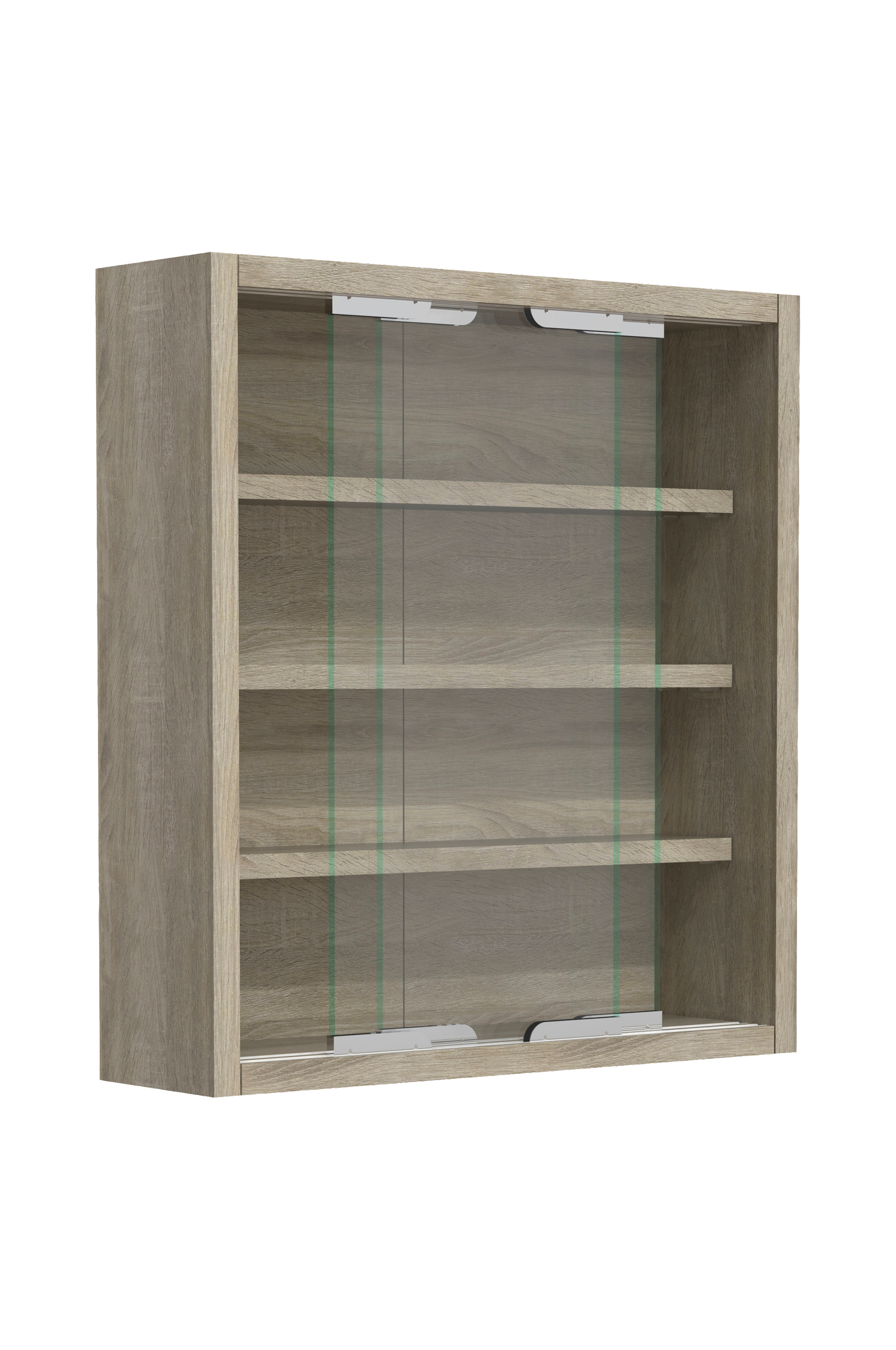lagt stor vægt på praktisk brug og et tidløst design. Vitrineskabet har to glasskydedøre, og bag dem er der tre hylder til fire rum.