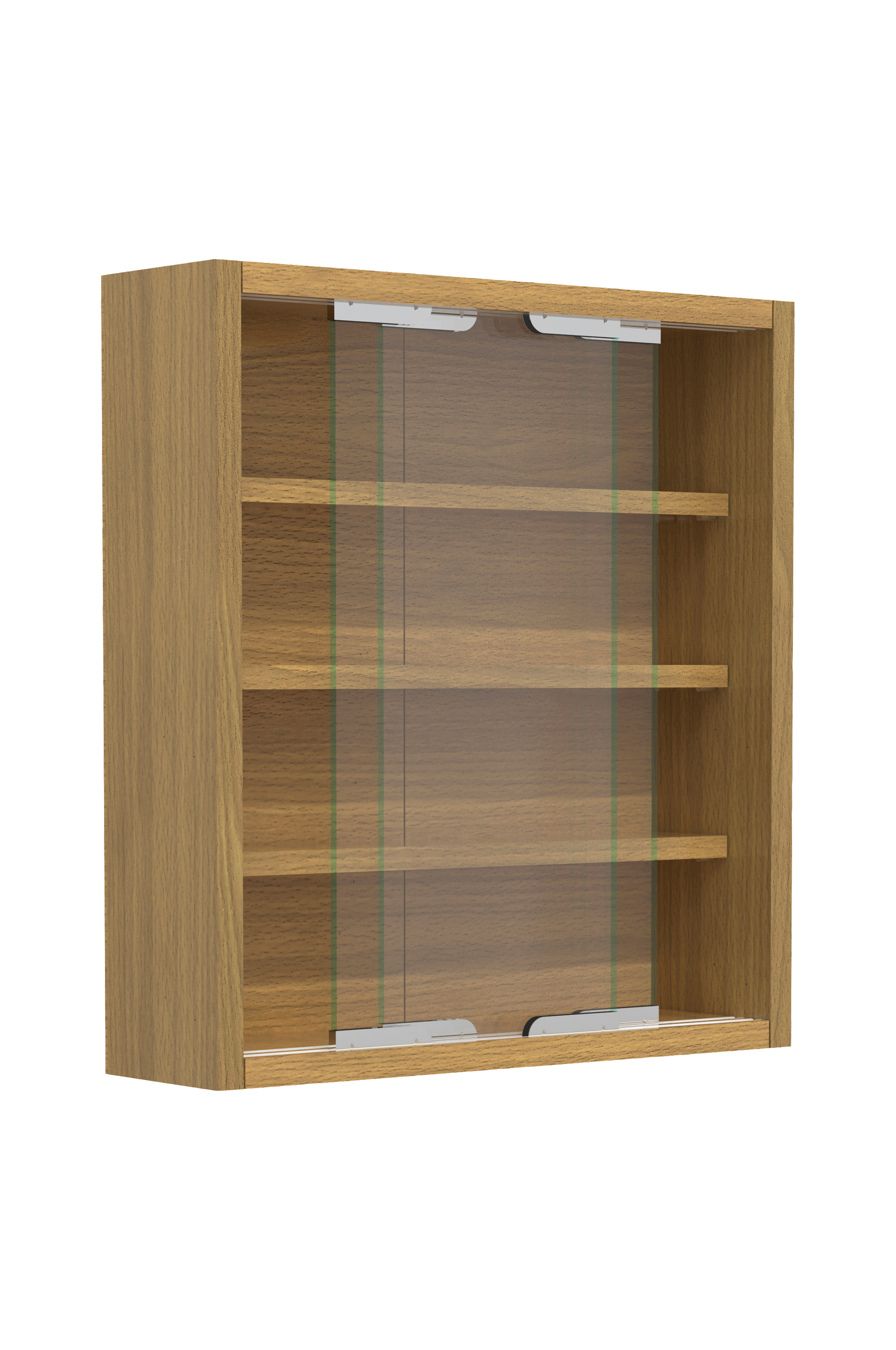 lagt stor vægt på praktisk brug og et tidløst design. Vitrineskabet har to glasskydedøre, og bag dem er der tre hylder til fire rum.