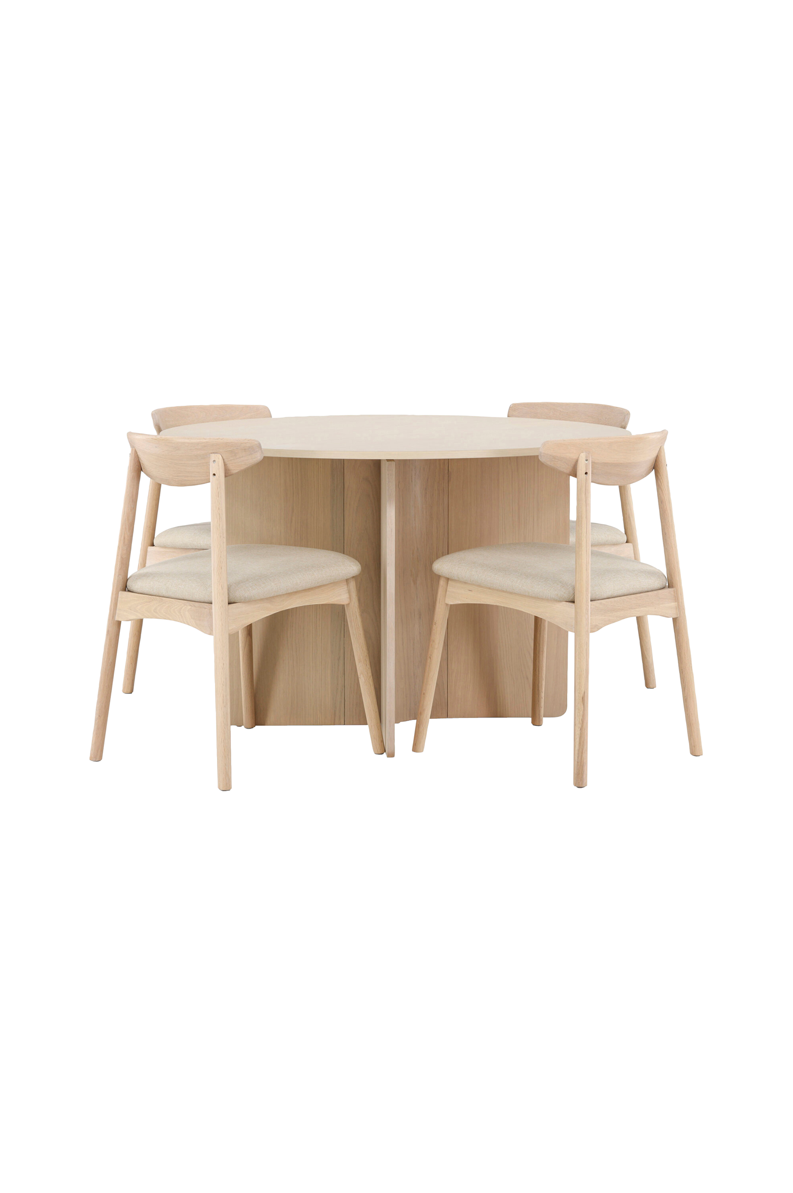 En moderne kontrast, der løfter hele rummet. Tyresö-spisesættet ø120 kombinerer det dristige bord med skandinavisk inspirerede ven-stole - en perfekt balance mellem varme og elegance.