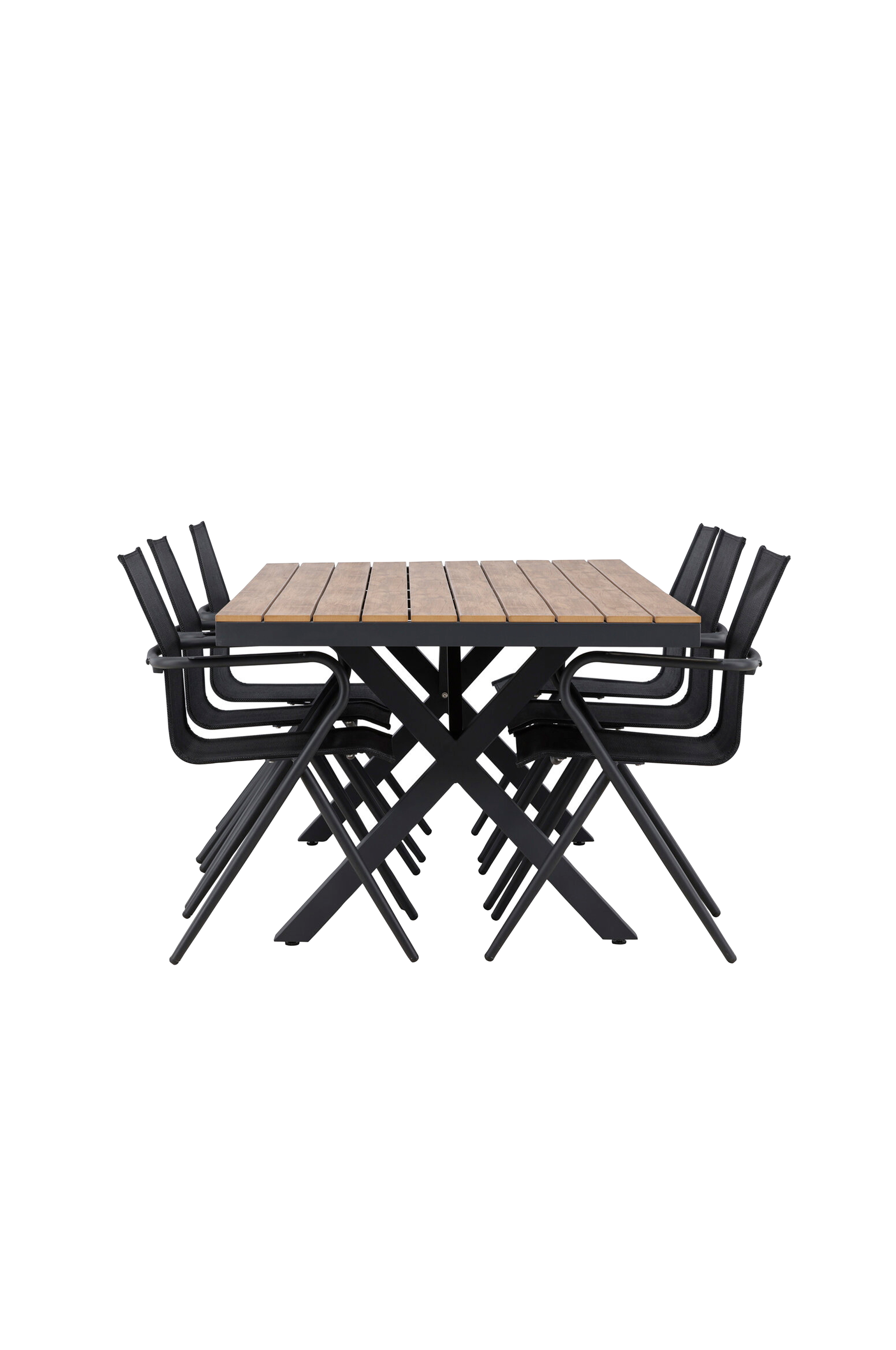 garcia bordet er en imponerende kreation med generøse dimensioner på 100x200 cm, lavet af aluminiumsmateriale. Den elegante farve giver en varm og indbydende fornemmelse i rummet og skaber en atmosfære af afslappet elegance. Stolene alina er fremstillet af det samme aluminiumsmateriale som bordet og kommer i en tidløs farve, der supplerer bordets nuance perfekt. Med seks stole i gruppen kan du nemt invitere familie og venner til hyggelige middage og sammenkomster.