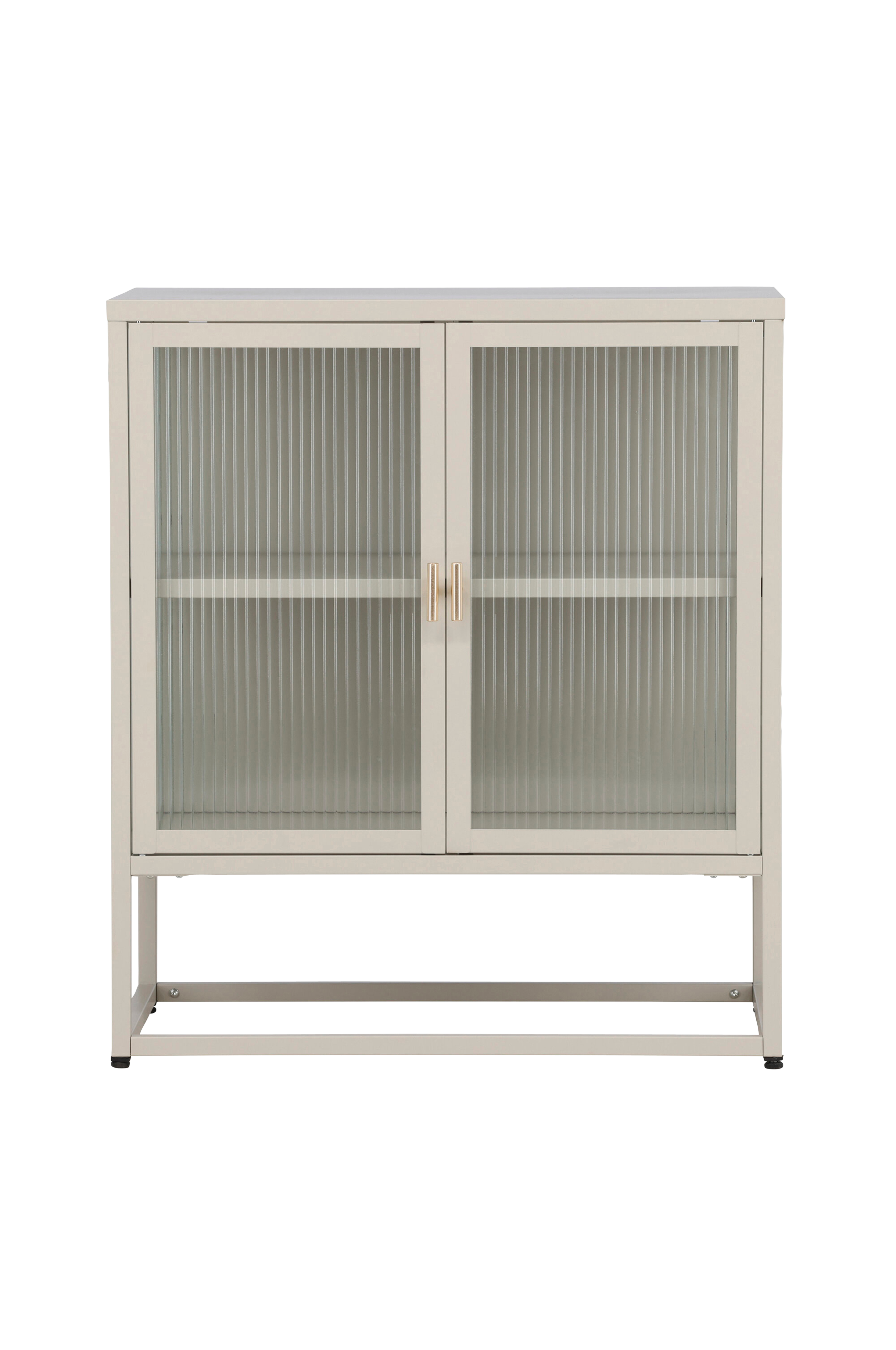 Dette slanke skab i en blød beige tone passer perfekt i stuen, gangen eller køkkenet. Skabet har to glasdøre, der giver udsyn, mens glassets let strukturerede overflade skaber en diskret og elegant fornemmelse. Bag lågerne er der en hylde, som gør det nemt at organisere og opbevare dine ejendele på en stilfuld måde. Et funktionelt og dekorativt møbel, der passer til ethvert hjem.
