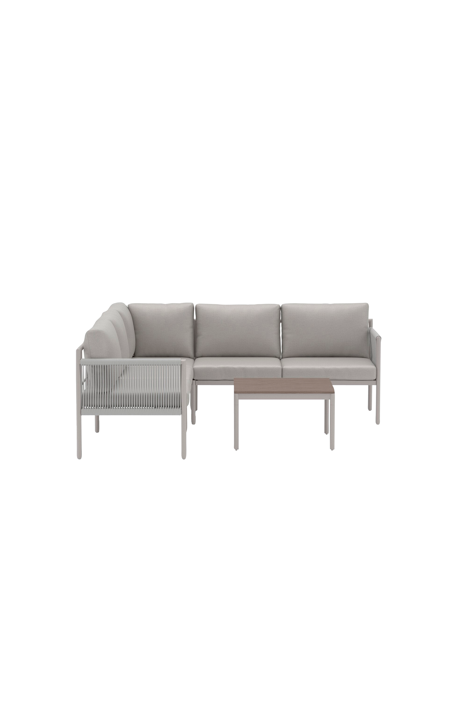 Skab et elegant og indbydende udendørs loungeområde med kos-hjørnesofaen i beige. Det moderne design med rene linjer og subtile vævede detaljer er parret med bløde hynder, der giver enestående komfort, hvilket gør sofaen til et naturligt samlingspunkt på gårdspladsen, terrassen eller i haven.