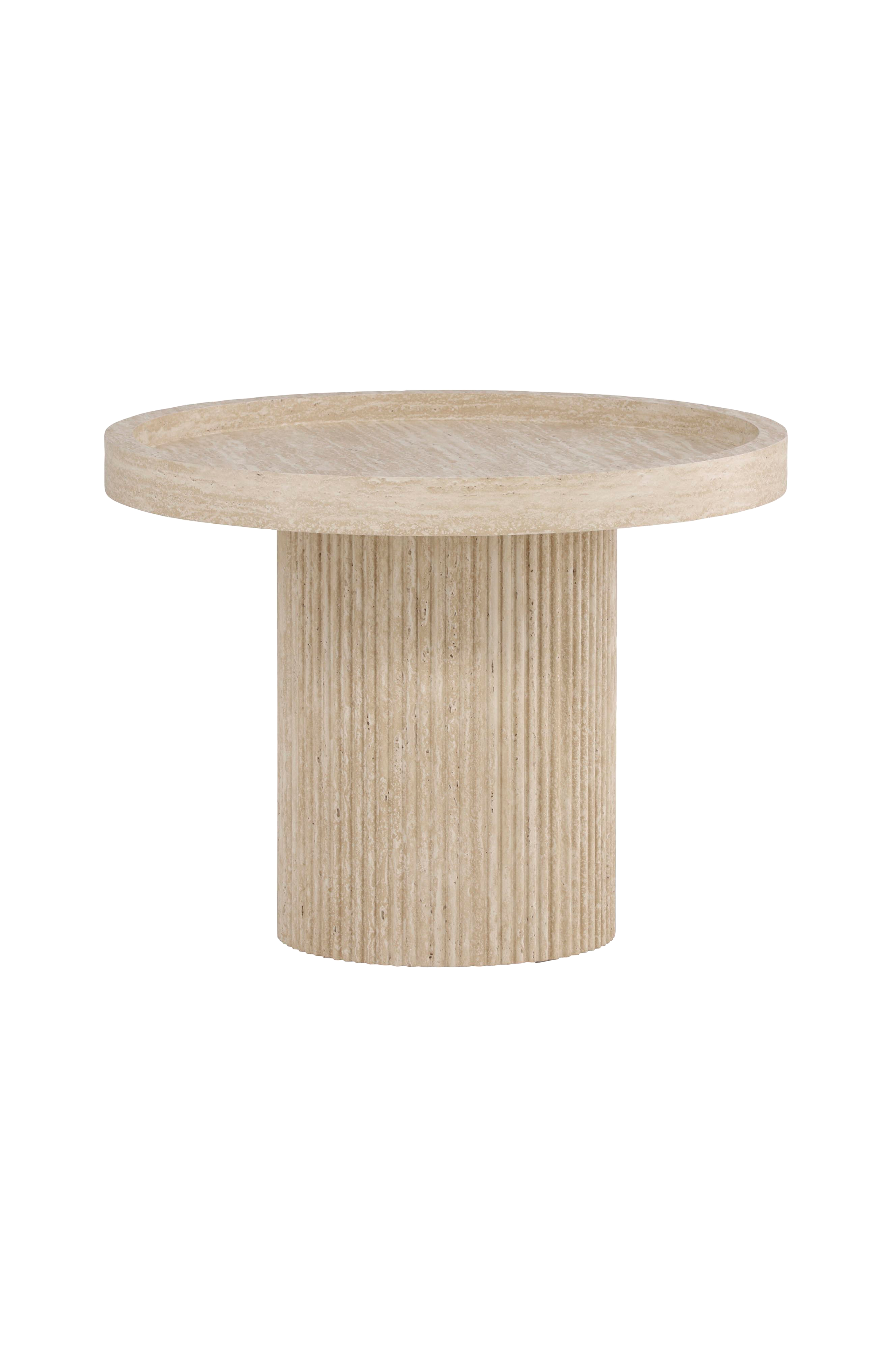 Bordet er lavet i en travertin-look finish, der giver en varm, naturligt beige tone, der passer til en bred vifte af indretningsstile. Det har et cylindrisk ben med ribbet design, der giver både stabilitet og en stilfuld detalje.