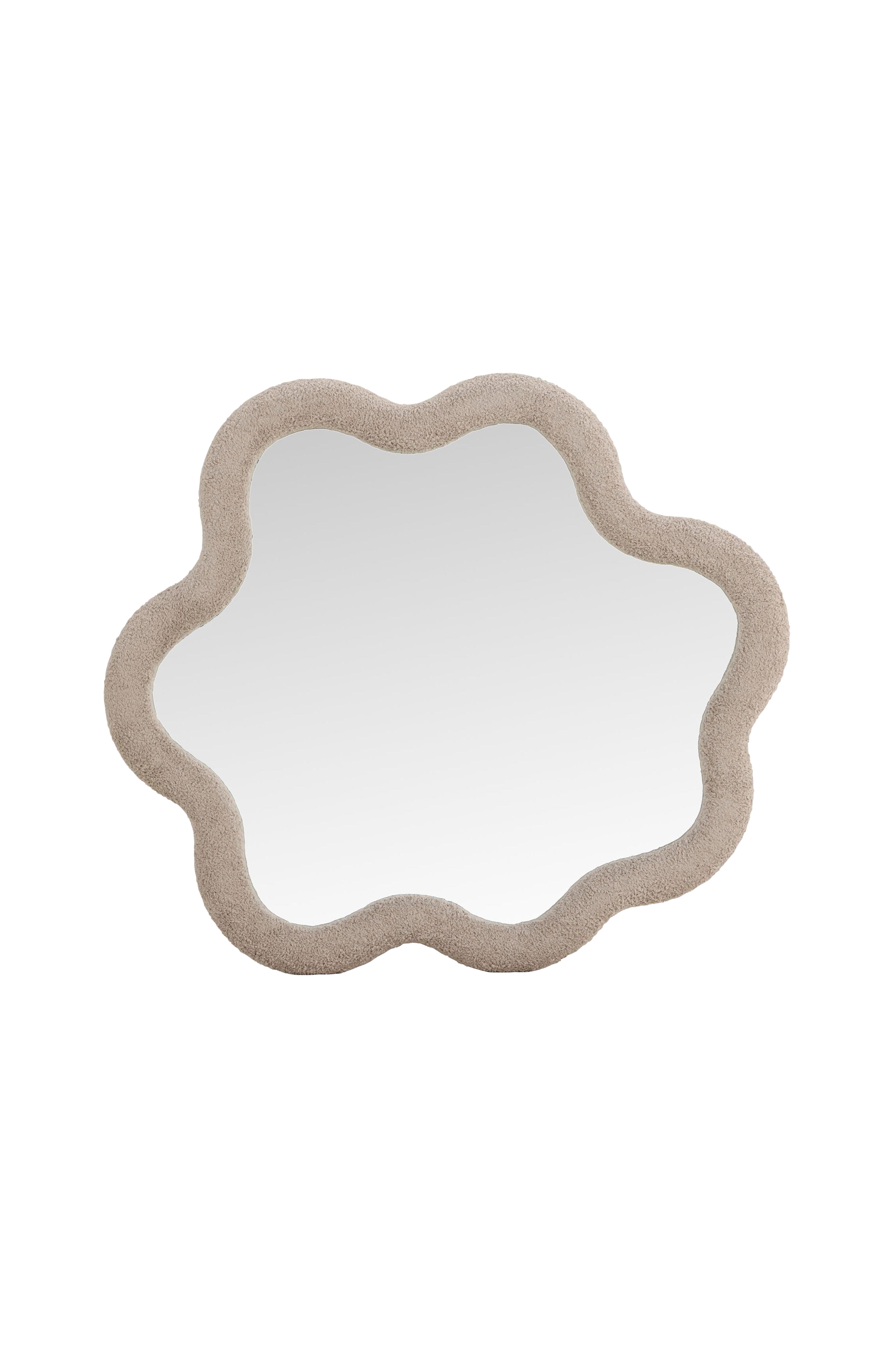 De generøse mål på 70x70 cm gør Kungsbacka til et dekorativt blikfang, samtidig med at den tjener et praktisk formål i hverdagen. Rammen er dækket af et beige bouclé-stof, hvis tekstur forstærker spejlets indbydende og trendy karakter. Vægbeslag er inkluderet