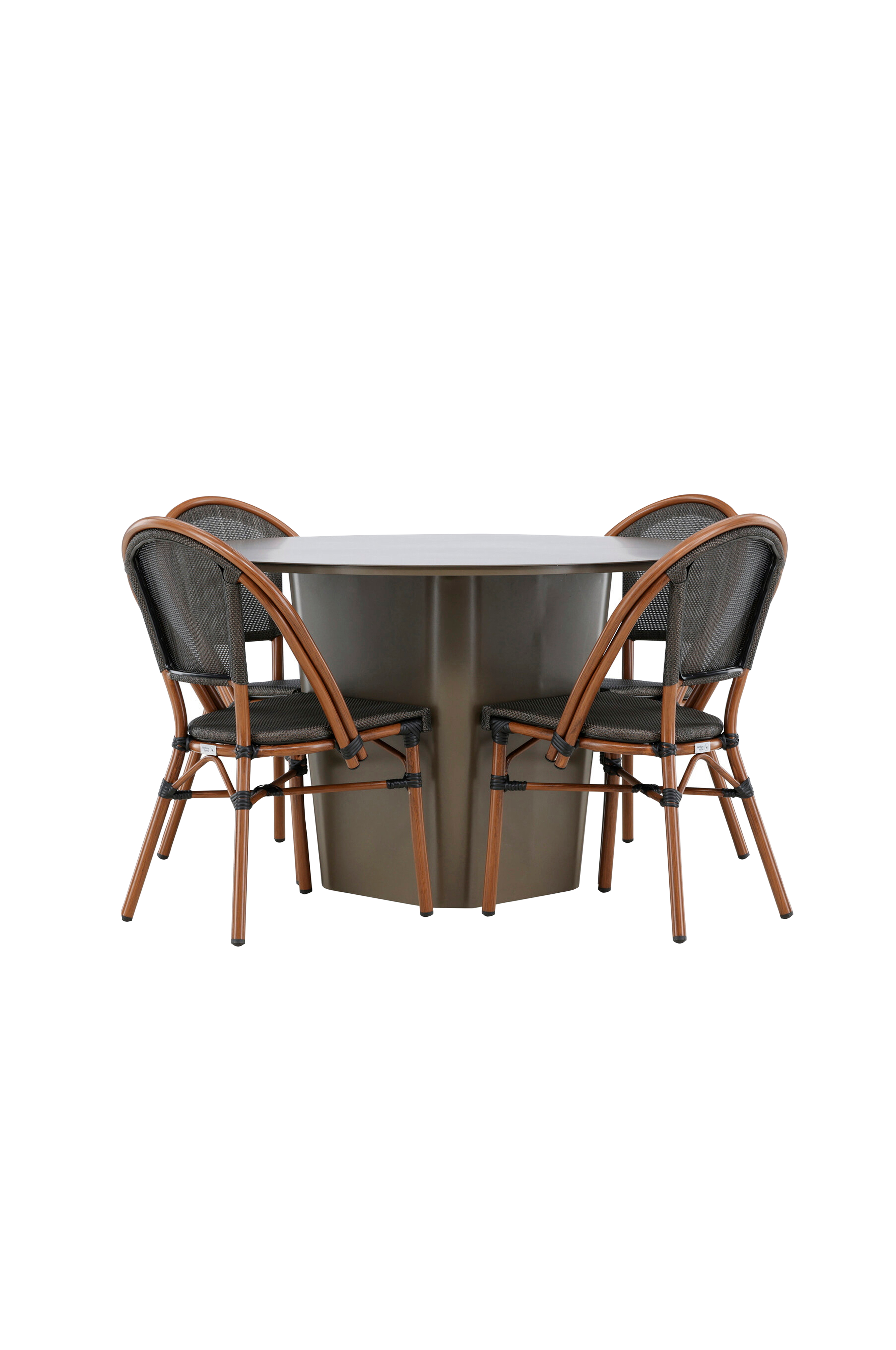 Dette spisesæt er ideelt til udendørs brug og skaber en atmosfære af kammeratskab og venskab med sit jordnære design. Med fire stole inkluderet er dette sæt komplet til at skabe mindeværdige øjeblikke og nyde afslappede måltider udendørs.