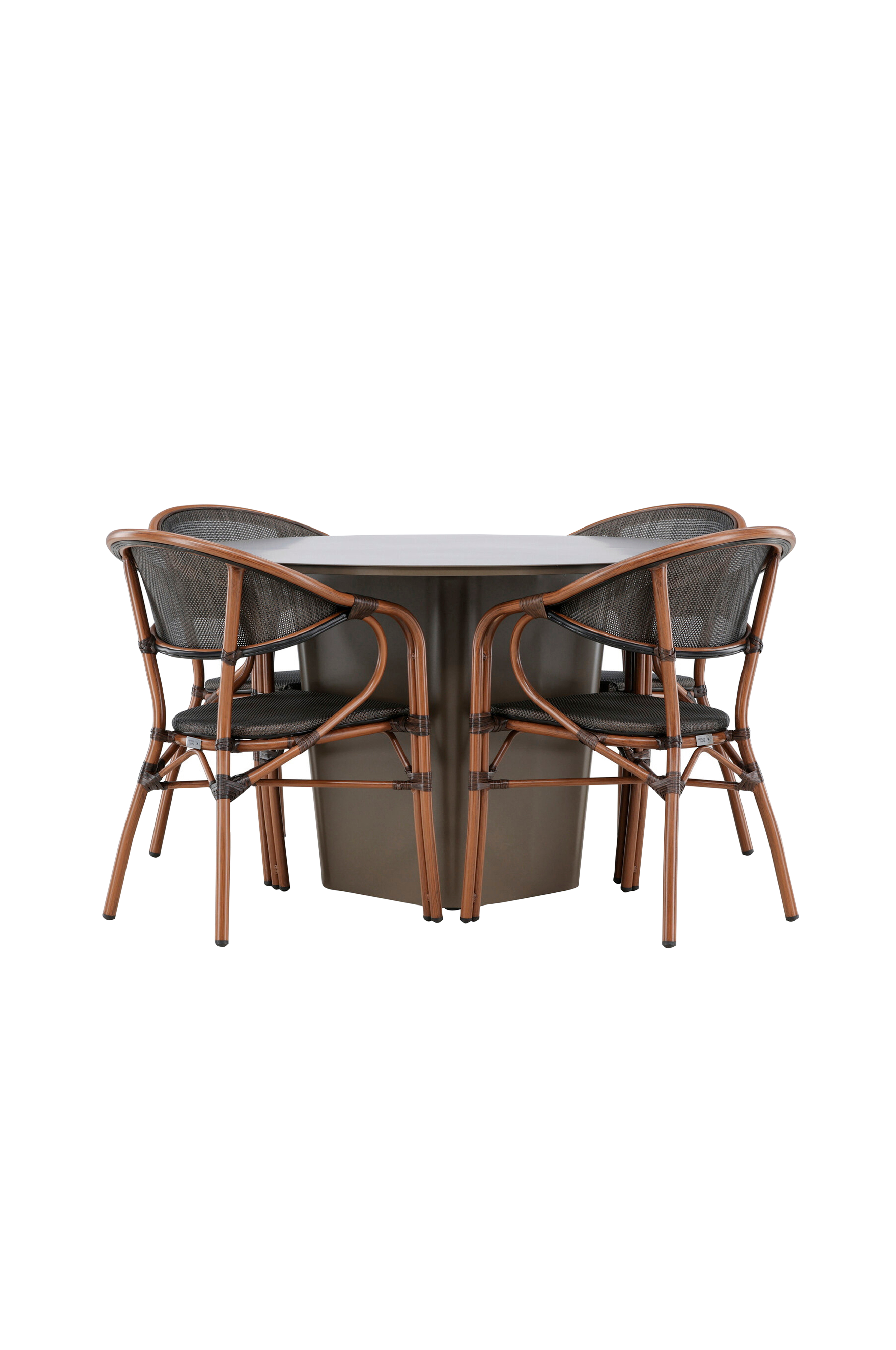 Dette spisesæt er ideelt til udendørs brug og fungerer som en indretningsdetalje, der samler familie og venner. Der medfølger fire stole, så sættet er komplet til at skabe mindeværdige øjeblikke og nyde afslappede måltider udendørs.
