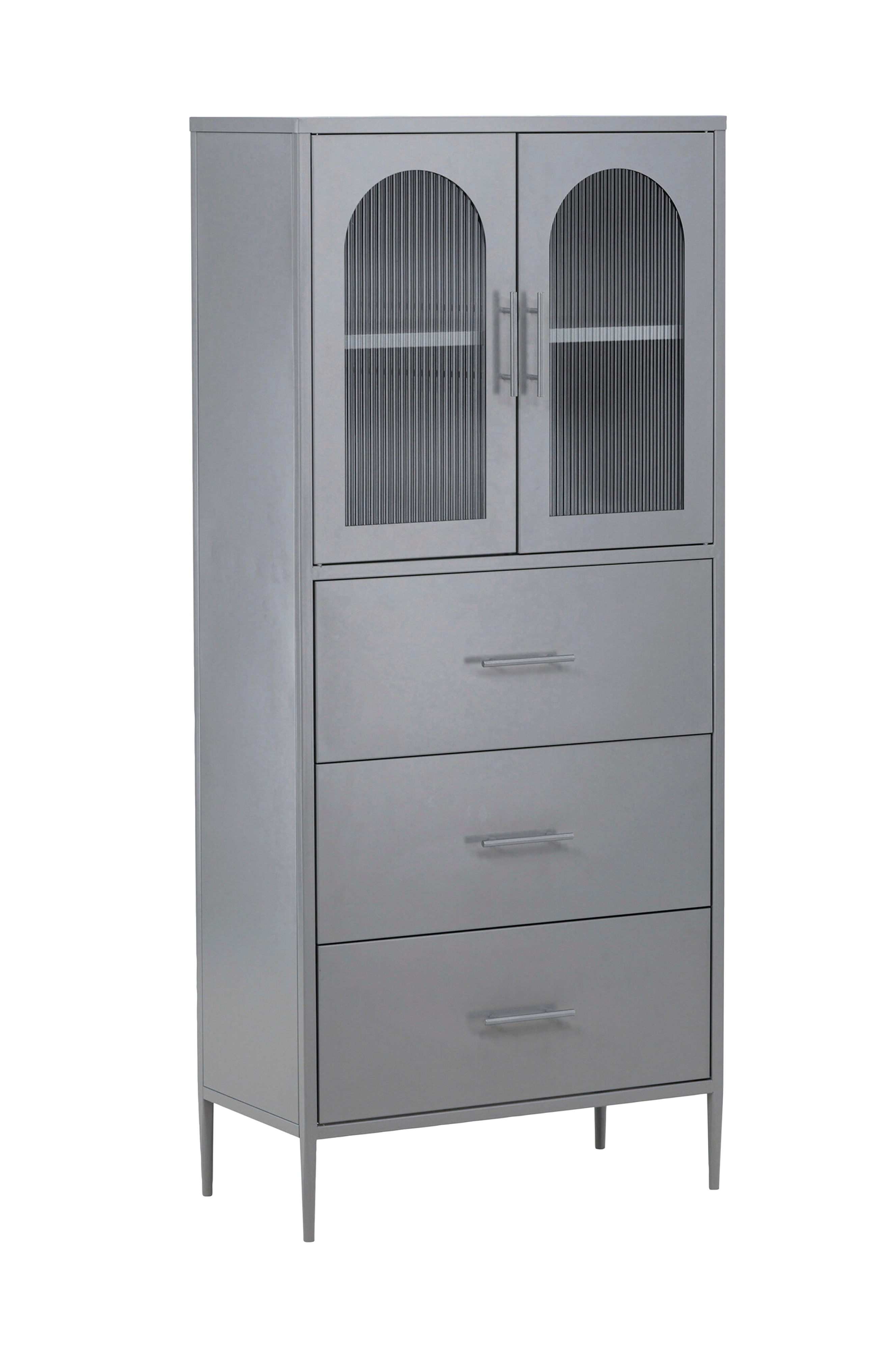 Det statelige opbevaringsskab i en trendy farve - lad os præsentere La Paz! Dette pulverlakerede skab kombinerer elegance med funktionalitet på en vidunderlig måde. Håndtagene tilføjer et subtilt strejf af luksus til overfladen af skabet og fanger straks din opmærksomhed. Med sine fire smalle ben skaber skabet en følelse af lethed. Tre generøse skuffer i bunden tilbyder skjult opbevaring og hjælper med at holde dit rum organiseret og ryddeligt. Overskabet har to smukt bølgede glaslåger, som giver et lille indblik i dets indhold. Det bueformede design tilføjer et strejf af elegance og skaber en storslået følelse i dit hjem. Lad dette skab formidle følelsen af struktureret orden, hver gang du træder ind i rummet. Fyld det med dit yndlingsservice, smukke glas og andre ting, du gerne vil have inden for rækkevidde. Dette skab vil smukt dekorere din stue og gøre livet lidt lettere at holde organiseret!