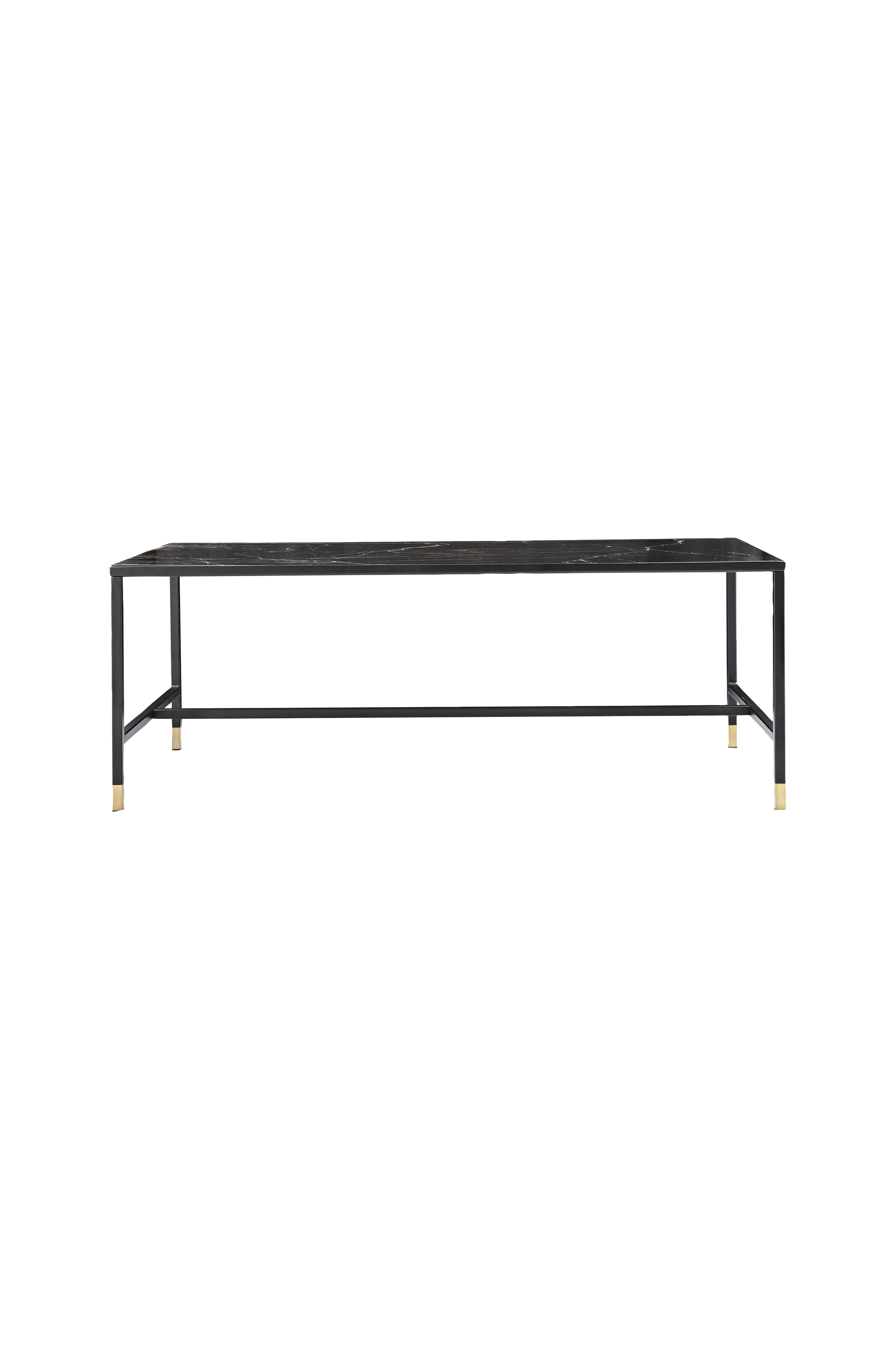 Et rektangulært bord med en bordplade i glas med marmorlook og ben af sort metal med fine børstede messingdetaljer forneden. Bredde: 60 cm Højde: 48 cm Længde: 130 cm Kræver let montering.