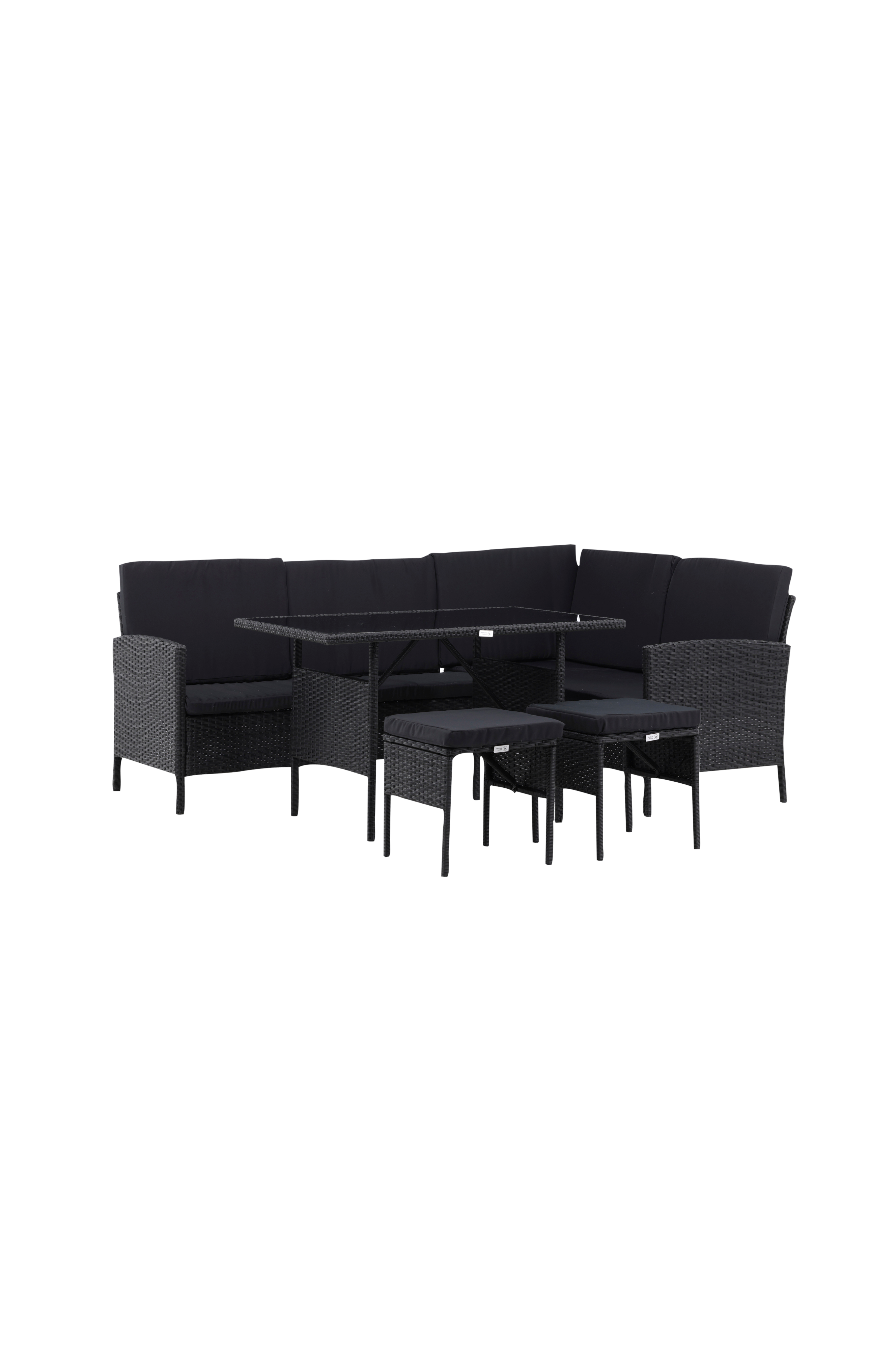 Knock sofagruppe i stål og wicker samt et bord med en bordplade i glas. Gruppen består af 1 sofa, 2 skamler og 1 sofabord. Sofagruppen har plads til 6 siddende gæster. Bordets mål: Højde: 65 cm, Bredde: 70 cm, Længde: 110 cm. Sofaens mål: Siddehøjde: 34 cm, Siddebredde: 135 cm, Siddedybde: 56 cm. Hynder medfølger.