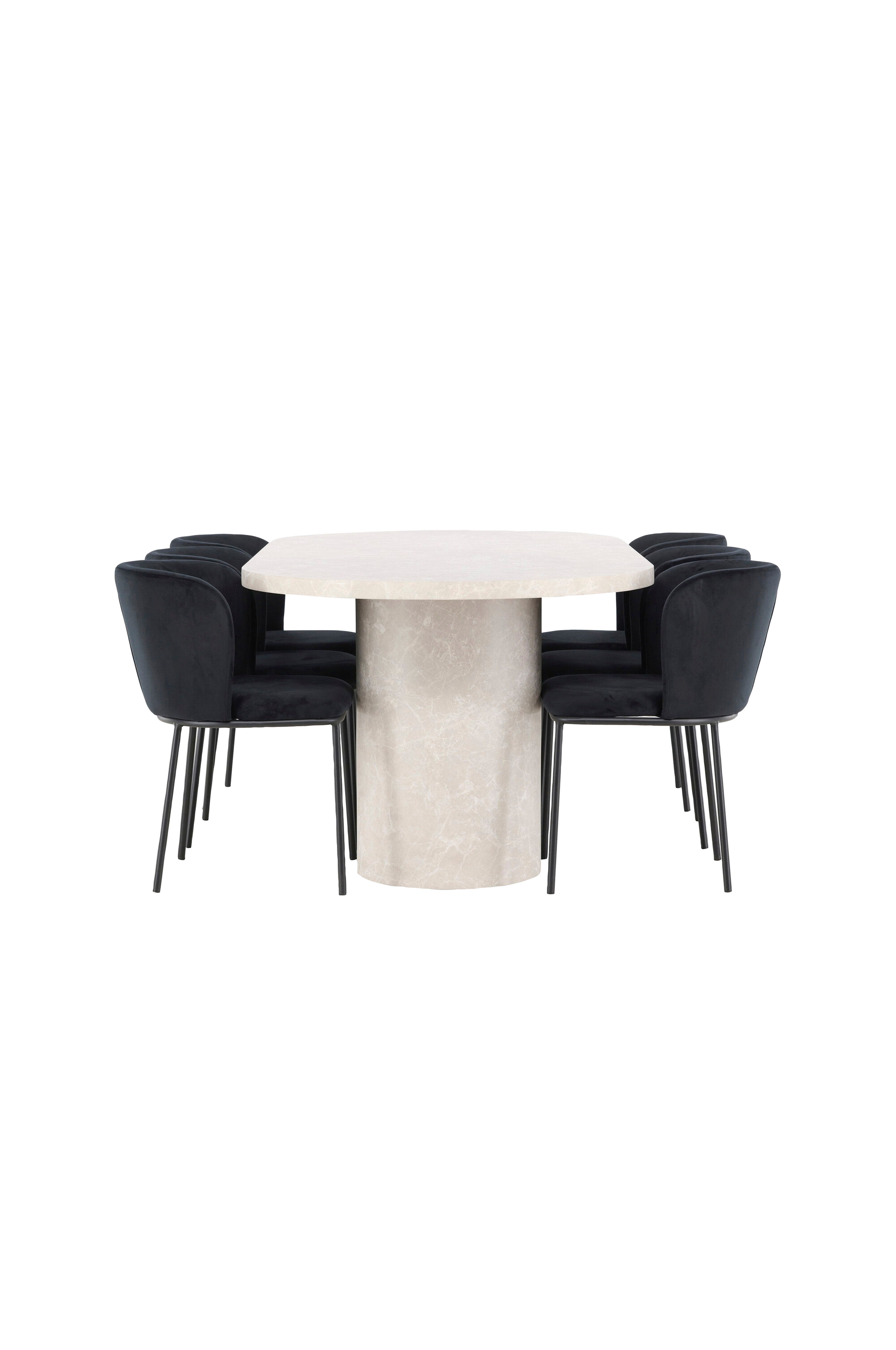 Opgrader din spiseplads med den perfekte kombination af elegance og funktionalitet - Narvik-spisebordet og Edina-spisestolene. Dette sæt skaber en sofistikeret atmosfære og giver et luksuriøst, tidløst udtryk til dit hjem.