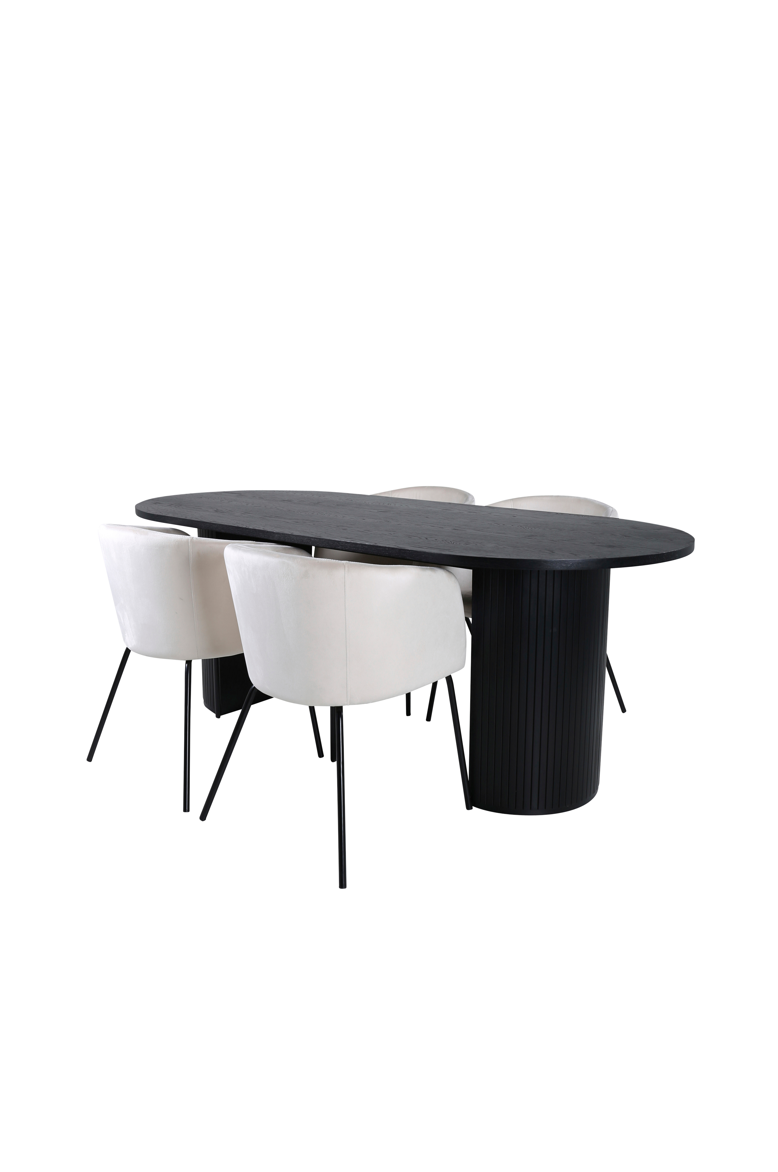 Bianca spisebord med oval bordplade i MDF med finér og bordben i træ og MDF. Matches med 4 Berit spisebordsstole med sæde i velour og stoleben i jern. Bord og stole kræver let montering. Bordets mål: Længde: 200 cm, bredde: 90 cm, højde: 75 cm. Stolenes mål: Siddedybde: 45 cm, Siddebredde: 55 cm, siddehøjde: 49 cm.
