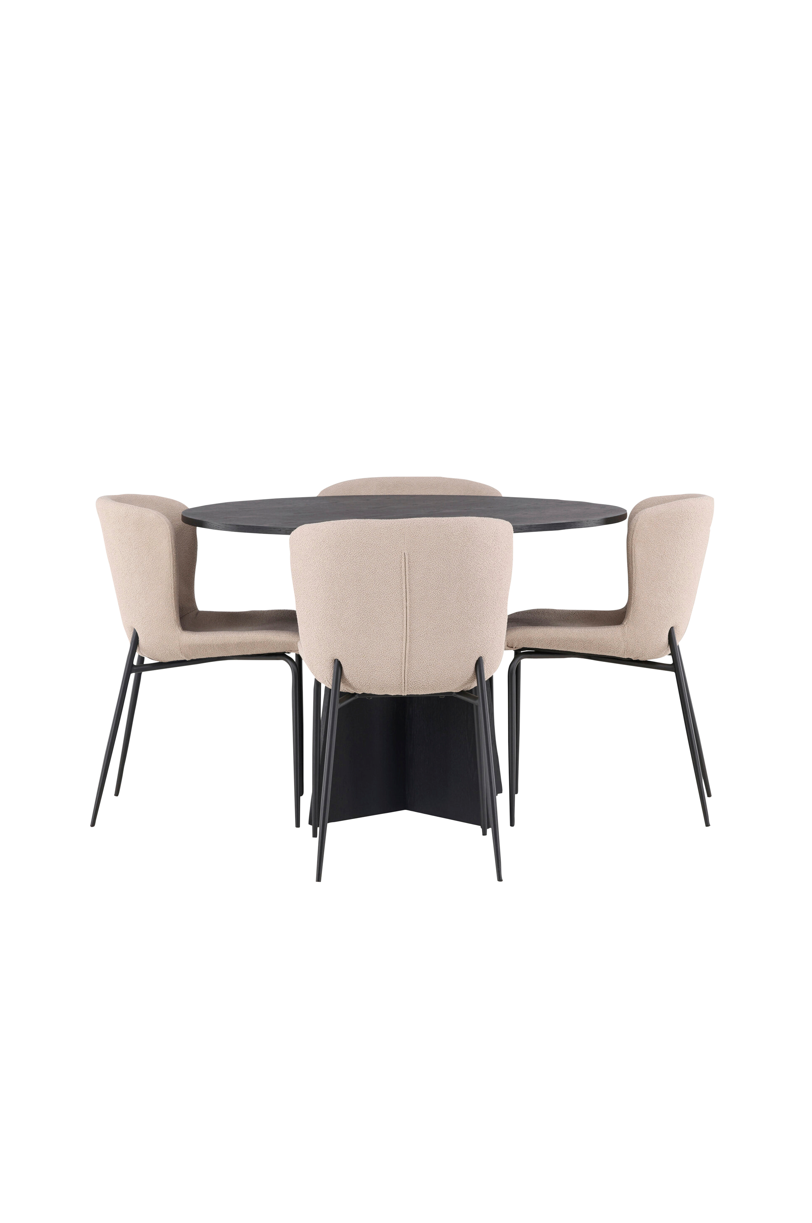 Gennemtænkt og stilrent! Det runde spisebord Bootcut i gennemgående farve har en MDF-bordplade med finer og et designrigt stel, der giver et lækkert indtryk til helheden. Her sammen med trendy spisebordsstole fra serien Modesto. Stolen er fuldpolstret med lodnet stof med stilfulde smalle metalstoleben. Det let rundede ryglæn og den polstrede siddehynde giver ekstra komfort og forlænger hyggelige måltider omkring spisebordet. Det bliver ikke bedre end det her!