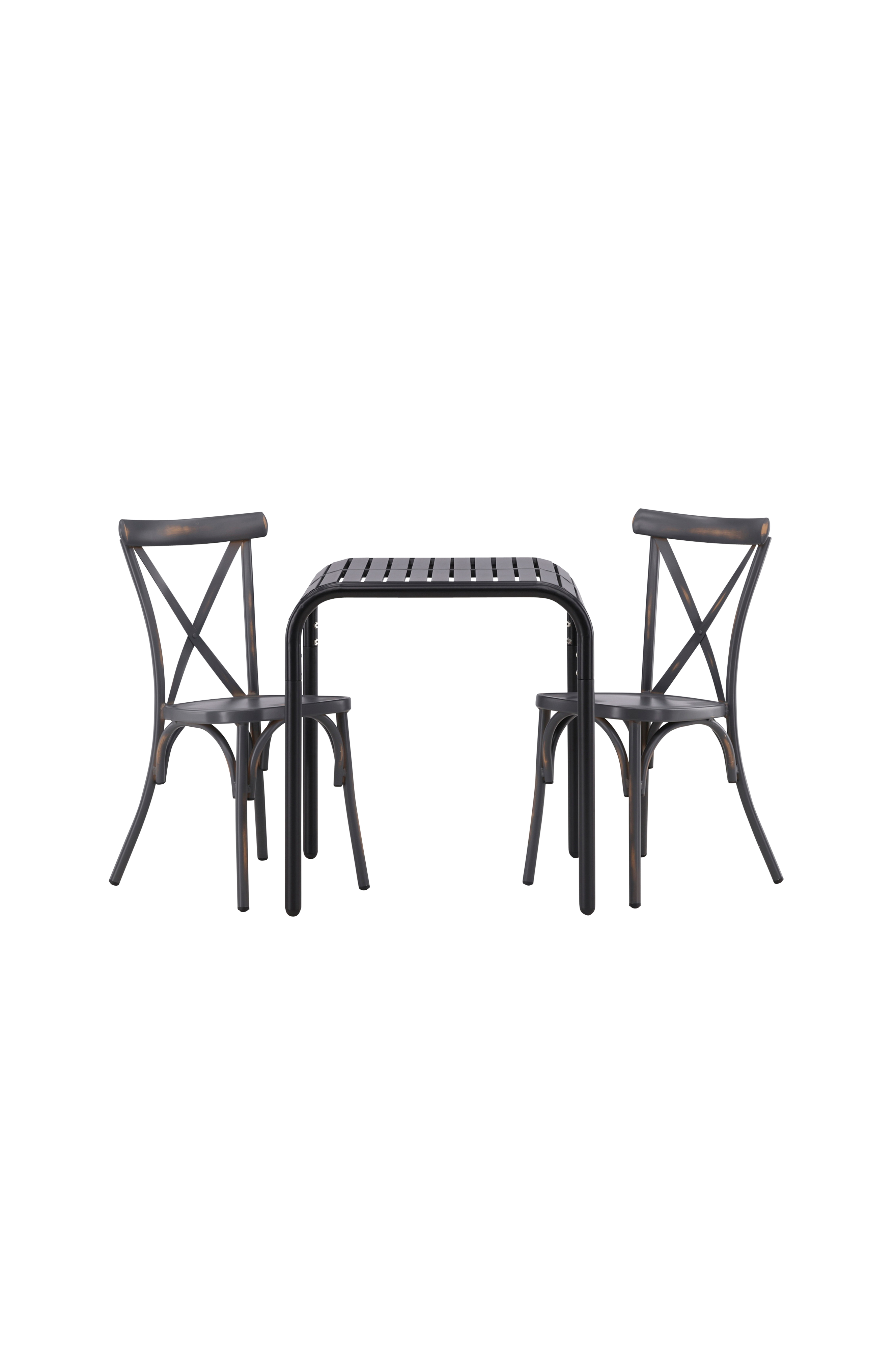 Denne cafégruppe er lige så matchende, som den er tidløs! Bordet fra Borneo-serien har fleksible former og et tidløst skandinavisk design. Bordpladen er ribbet og bølger ned langs kanterne ved benene. Helt udført i aluminium, som giver dig et slidstærkt bord, der er nemt at flytte rundt på. Her i lækker kombination med 2 stole fra serien Tablas. Stol har ett kryds ryglæn og let skrånende ben for et robust indtryk. Fremstillet udelukkende af aluminium i en sodet farve. Skab et moderne blikfang på din altan!