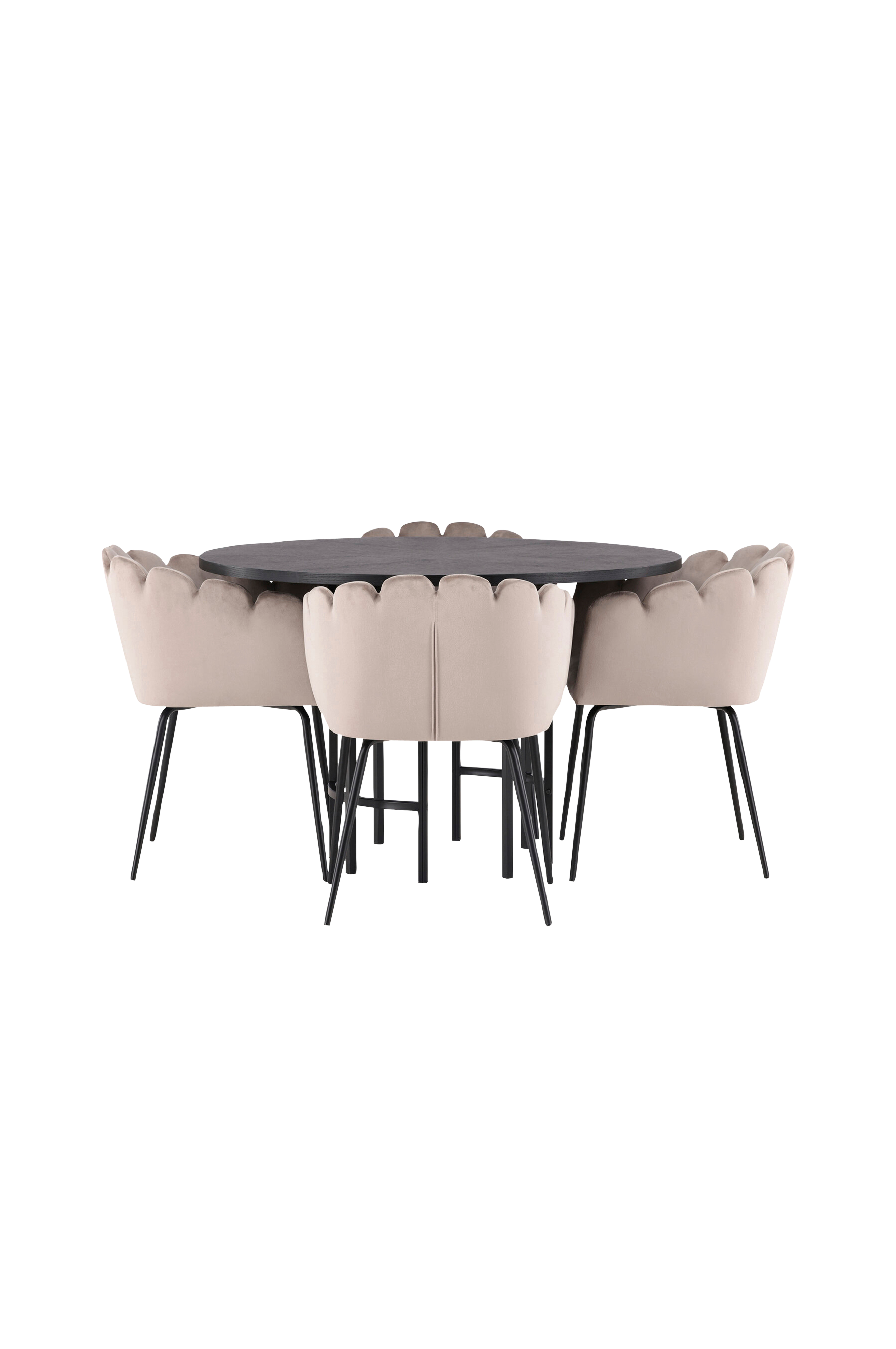 Det skal føles skønt at komme hjem og slå sig ned her! Det runde spisebord Copenhagen har en elegant MDF-bordplade og et dekorativt, cylinderformet metalstel. Her sammen med Venture Designs populære spisebordsstole Linhamn. Stolen har et indbydende design med en dekorativ muslingeskalformet ryg med dekorative syninger og et rundt sæde i smagfuldt velourstof. Benene er i pulverlakeret metal. En uimodståelig spisegruppe! Bordets mål: 115 cm.