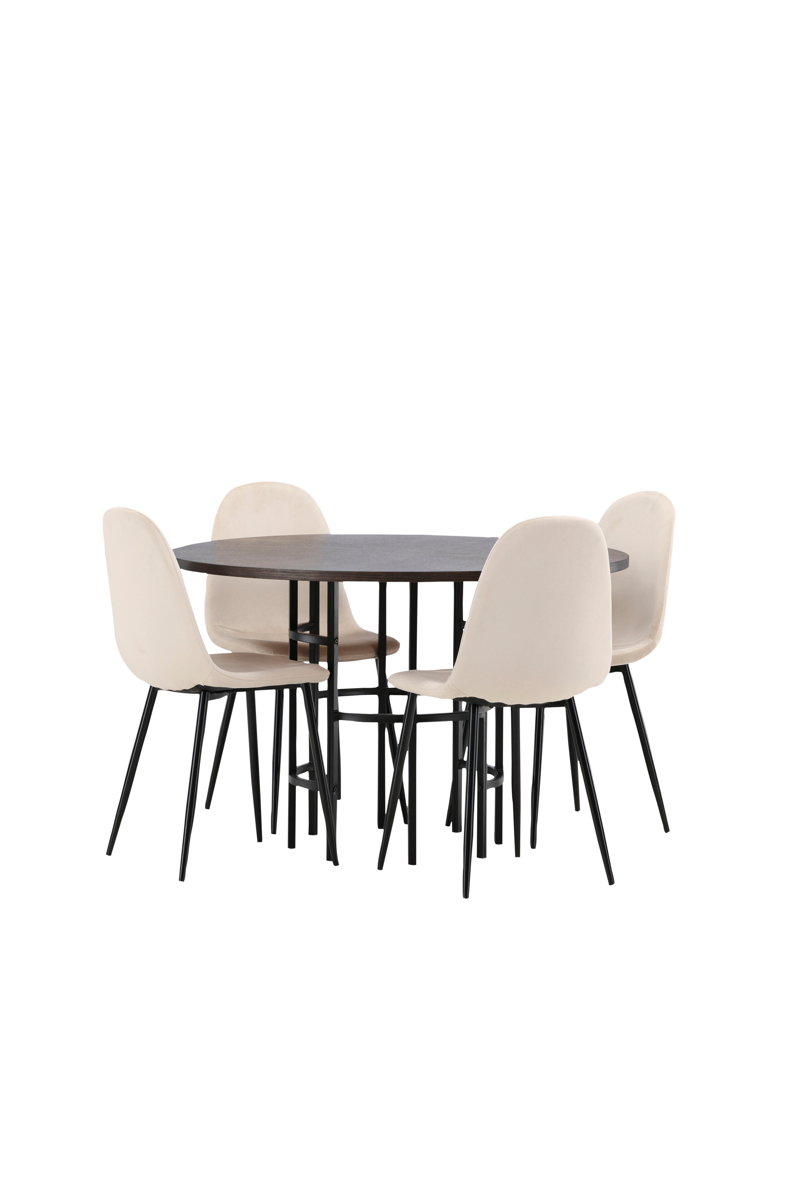 Stilren, moderne og tidløs - en spisegruppe som imponerer! Dette trendy spisebord fra Copenhagen-serien tilhører Furniture Fashion-kollektionen og har en sodet bordplade i MDF med finer og et dekorativt cylinderformet stel i metal. Her sammen med vores behagelige spisebordsstole fra serien Polar. Stolen har betræk og et afrundet ryglæn og sæde med velourstof med blød polstring. Ben i sort pulverlakeret metal. Slip for at skulle vælge mellem komfort og design!