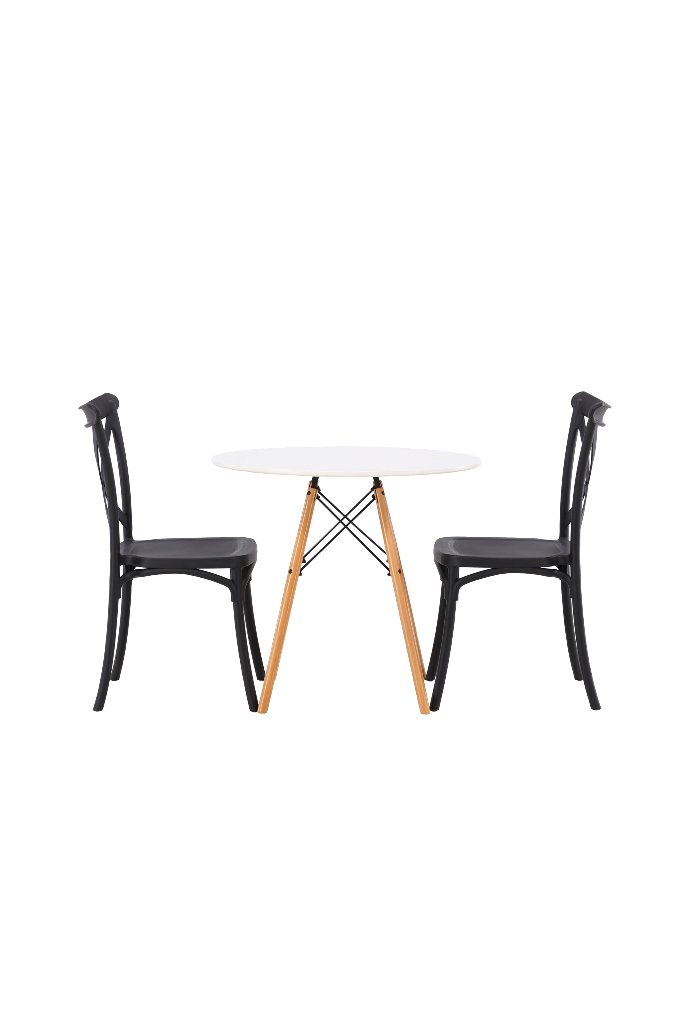 Selv det lille køkken kan indrettes fint! Det runde spisebord Danburi har et klassisk design med en rund bordplade i hvid MDF og let skråtstillede ben i bøgetræ med dekorative detaljer i sort stål. Her sammen med spisebordsstole fra serien Crosett. Stolen er helt lavet af det handy materiale plastik og har en mat sort farve, der holder til tidens tand. Lige så stilren som smart! Bordets diameter: 60 cm.