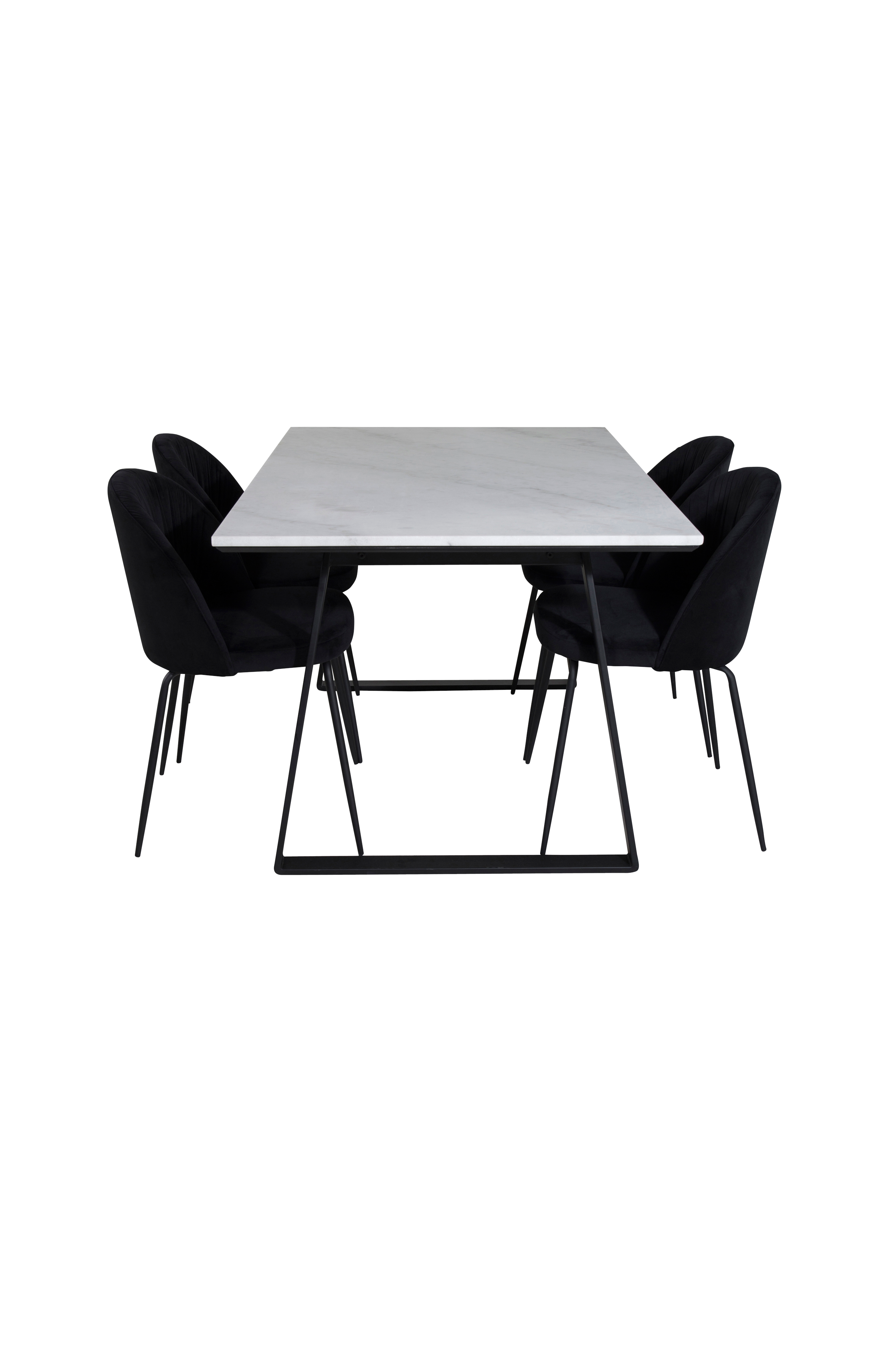 Estelle spisebord med bordplade i marmor og bordben i metal. Matches med 4 Wrinkles spisebordsstole med sæde i velour og stoleben i metal. Bord og stole kræver let montering. Bordets mål: Længde: 140 cm, bredde: 90 cm, højde: 74,5 cm. Stolenes mål: Siddebredde: 47 cm, siddedybde: 42 cm, Siddehøjde: 49,5 cm.