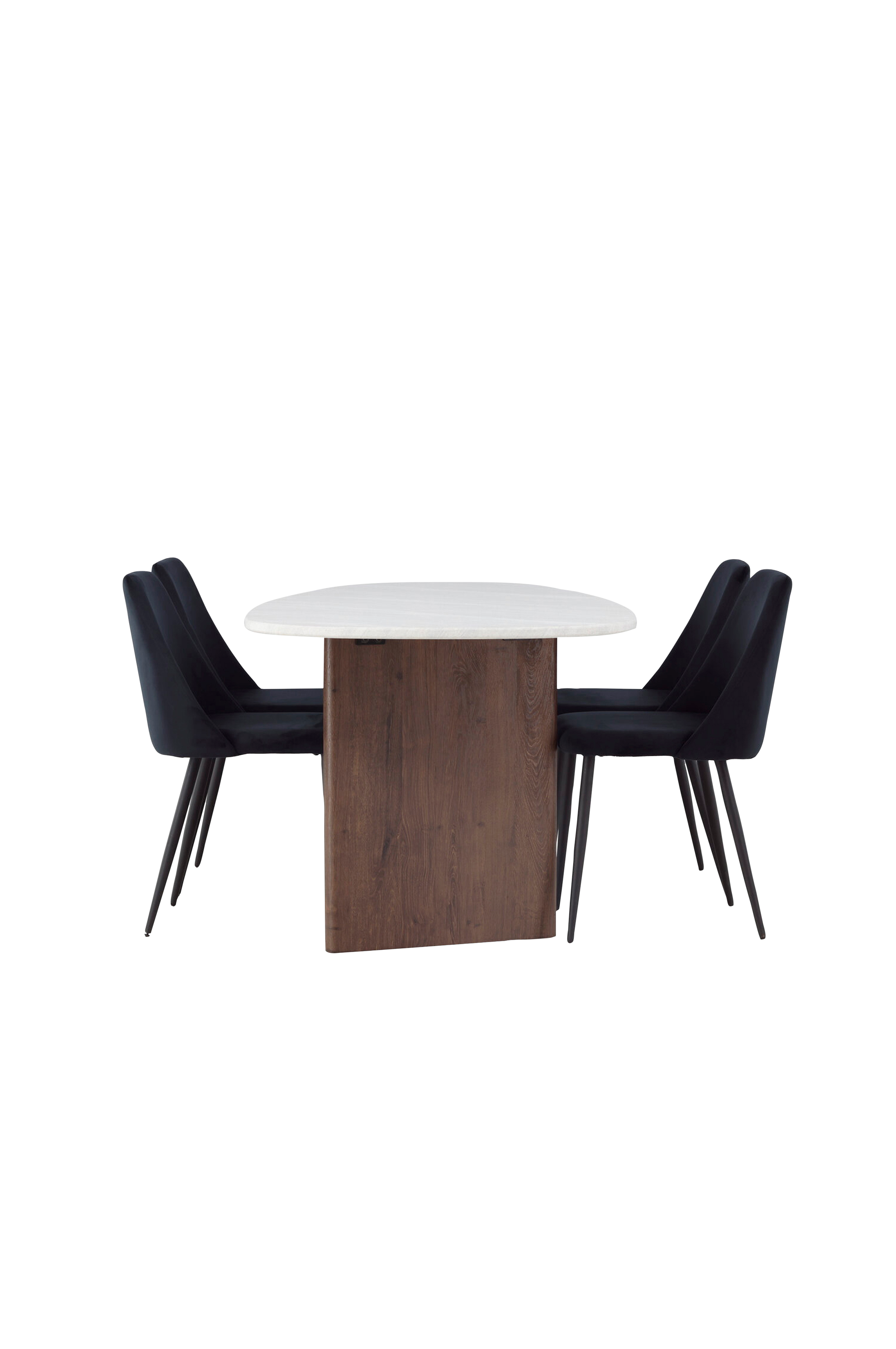 Det ovale Grönvik spisebord har en uregelmæssig bordplade i MDF med et betonlook, der giver et unikt præg til din indretning. De tynde træplader i en trendy farve, der understøtter bordet, giver det et elegant og stabilt præg. Med dette bord skaber du hurtigt et miljø, der ånder stil og charme. Her er bordet matchet med spisebordsstole fra Night-serien. Med sine fuldt polstrede sæder i sort velourstof og matchende sorte stoleben bringer Night en følelse af luksus og eksklusivitet til din stue. Hvert måltid bliver en fest!