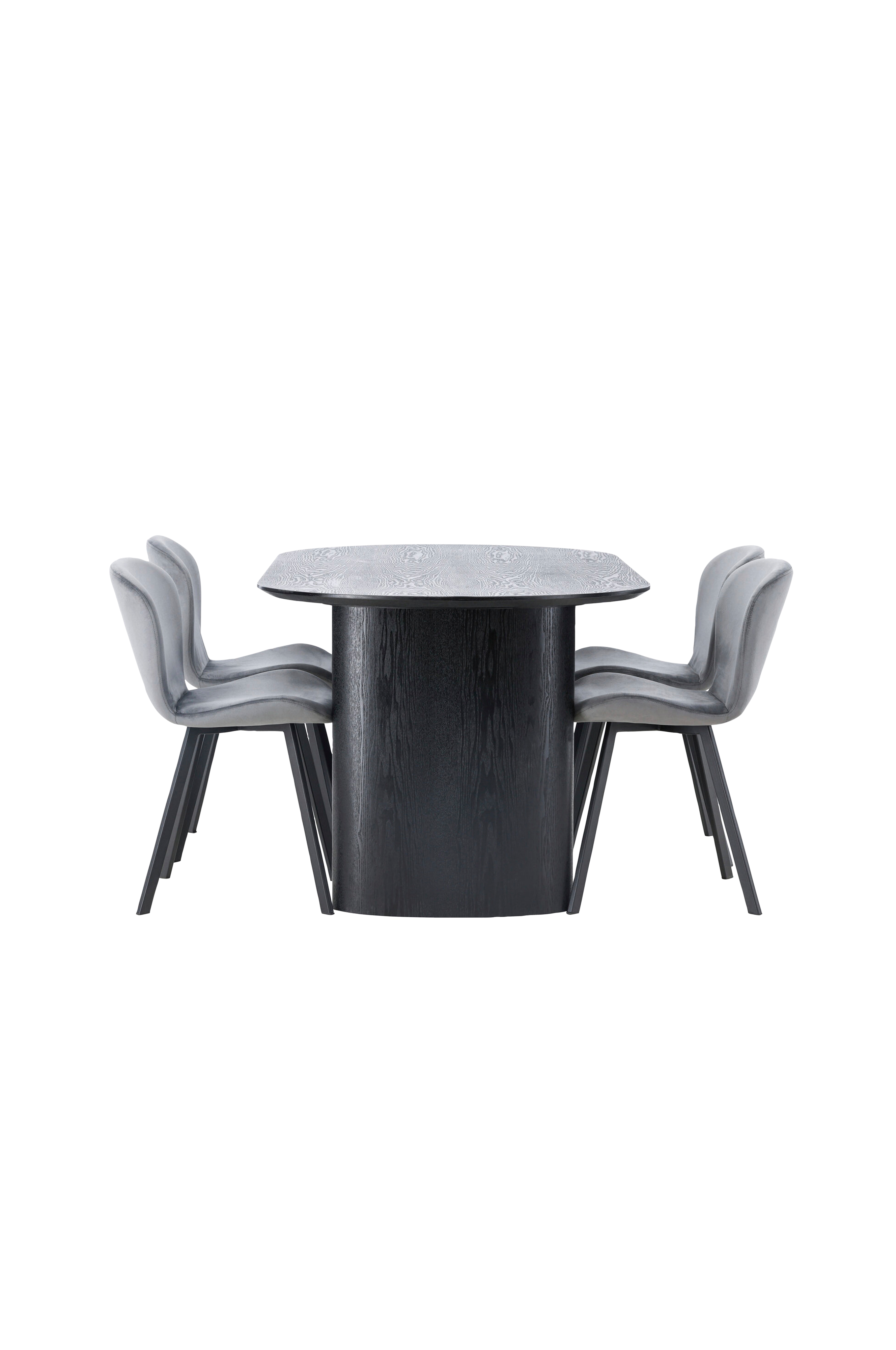 En behagelig farvekombination! Det ovale spisebord Isolde i stilfuld farve har et moderne design med en oval bordplade i MDF og robust stel, der giver et solidt indtryk. Det levende materiale giver smagfuld bevægelse til blikfanget. Her i en vidunderlig kombination med stole fra Lilja-serien. Stolen har et fleksibelt rundt design med sæde i polyesterstof og let udstrakte stoleben i metal. Møblér dagligstuen hyggeligt!