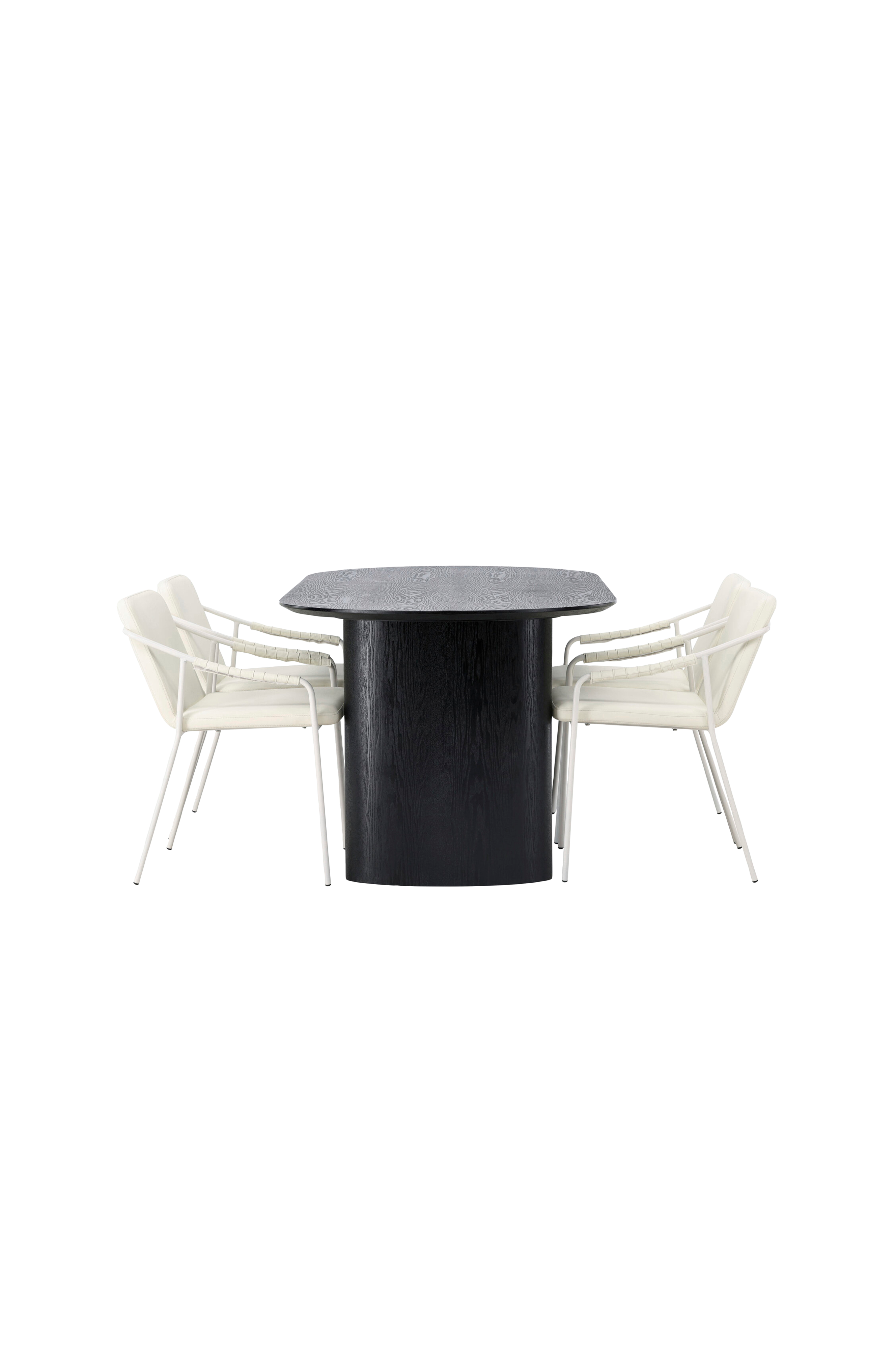 Indret dit hjem modebevidst! Det ovale spisebord Isolde i stilfuld farve har et moderne design med en oval bordplade i MDF og robust stel, der giver et solidt indtryk. Det levende materiale giver smagfuld bevægelse til blikfanget. Her sammen med spisebordsstole fra serien Tvist. Stolen har et polstret sæde og fuldpolstret design i PU med minimalistiske stoleben og integrerede stålarmlæn. Lige så trendsikkert som behageligt!