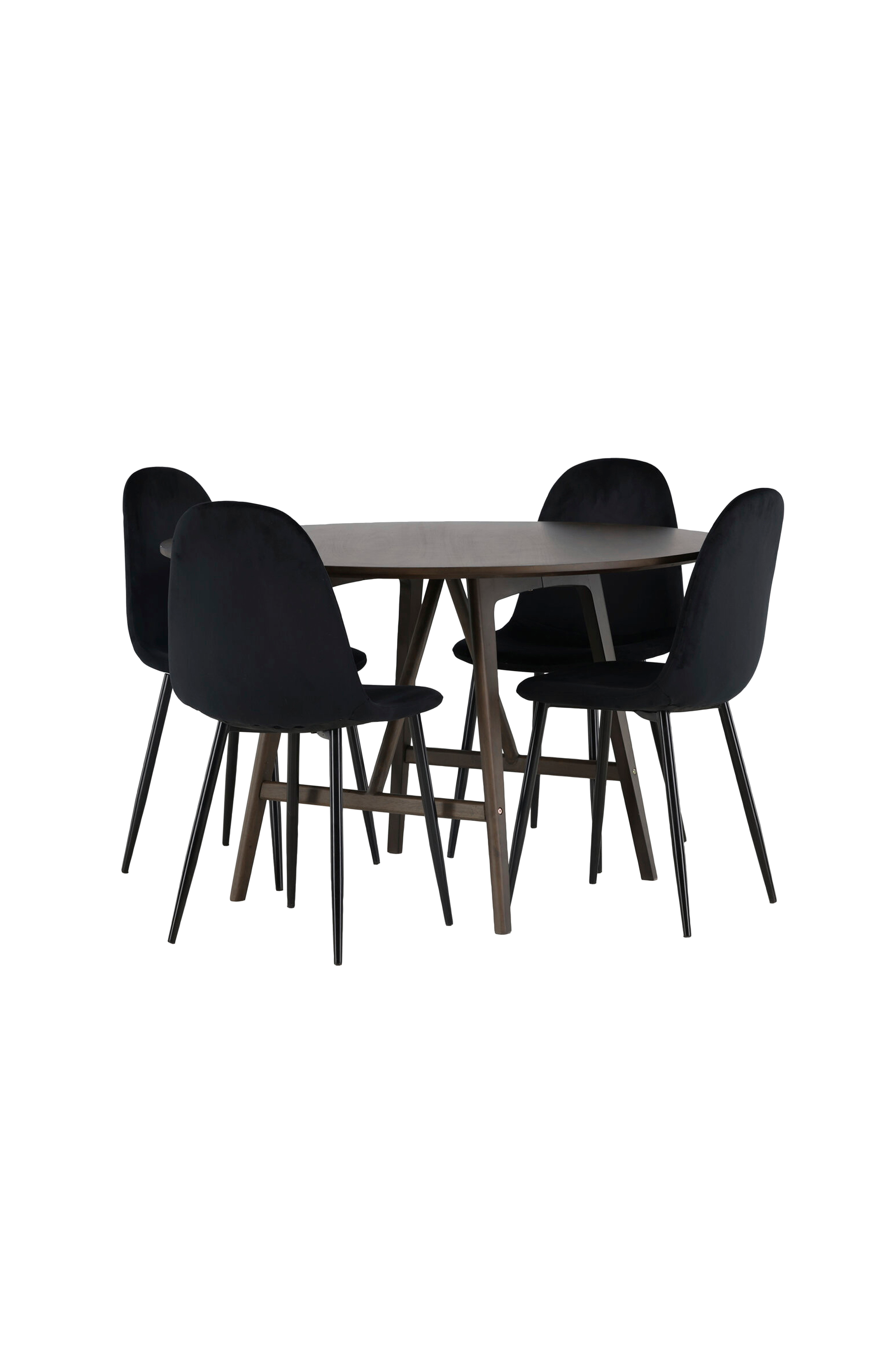 Det runde spisebord Kaseidon er perfekt til dig, der ønsker en stilfuld spisegruppe. Med sin runde MDF-bordplade og let skråtstillede ben i gummitræ, tilføjer dette moderne bord et trendy touch til din stue. Men prikken over i'et er den trendy farve, der giver bordet det lille ekstra, en varm tone, der hurtigt passer ind i det moderne hjem. Spisebordet er kombineret med de elegante spisebordsstole Polar. Stolene byder på et fuldpolstret design med afrundet ryg og sæde i velourstof, der giver en luksuriøs følelse. Den bløde polstring giver en behagelig oplevelse, så du får lyst til at blive siddende længe efter middagen er slut.