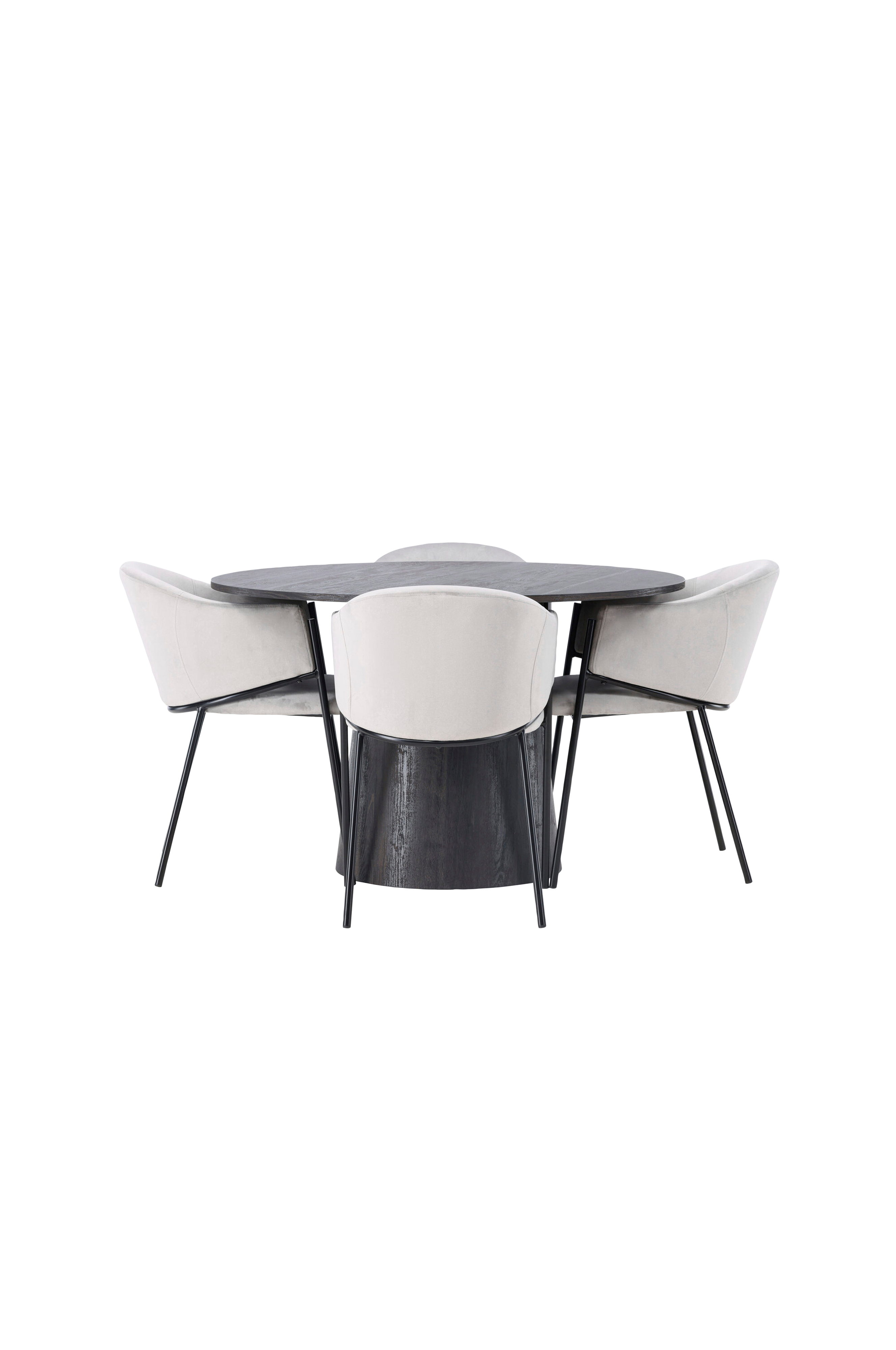 Dette helhedsdesign er både gennemtænkt og tidløst! Venture Designs vidunderlige, runde spisebord Lanzo har et gennemgående helhedsdesign i MDF med en tynd bordplade og et snoet cylinderformet stel, der er centreret under midten af bordet. Her sammen med moderne spisebordsstole fra serien Evelina. Stolen har fuldpolstret sæde med afrundet ryglæn i velourstof og dekorativt, minimalistisk benstel i stål. En perfekt kombination helt enkelt!