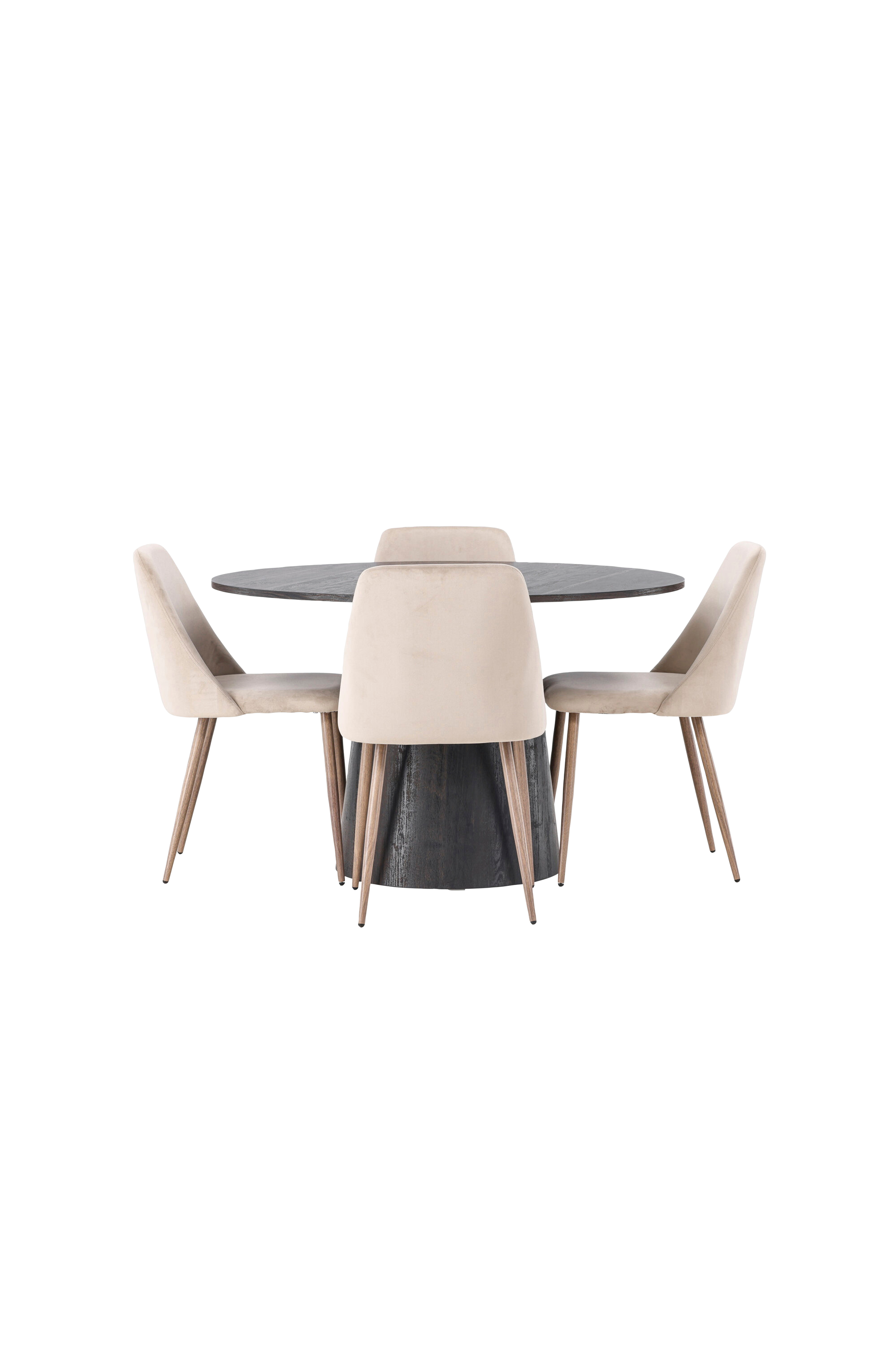 Varme toner og charmerende design! Venture Designs vidunderlige, runde spisebord Lanzo har et gennemgående helhedsdesign i MDF med en tynd bordplade og et snoet cylinderformet stel, der er centreret under midten af bordet. Her sammen med spisebordsstole fra serien Night. Stolen har fuldpolstret sæde i velourstof og stoleben i stål. En fantastisk spisegruppe helt enkelt!